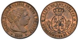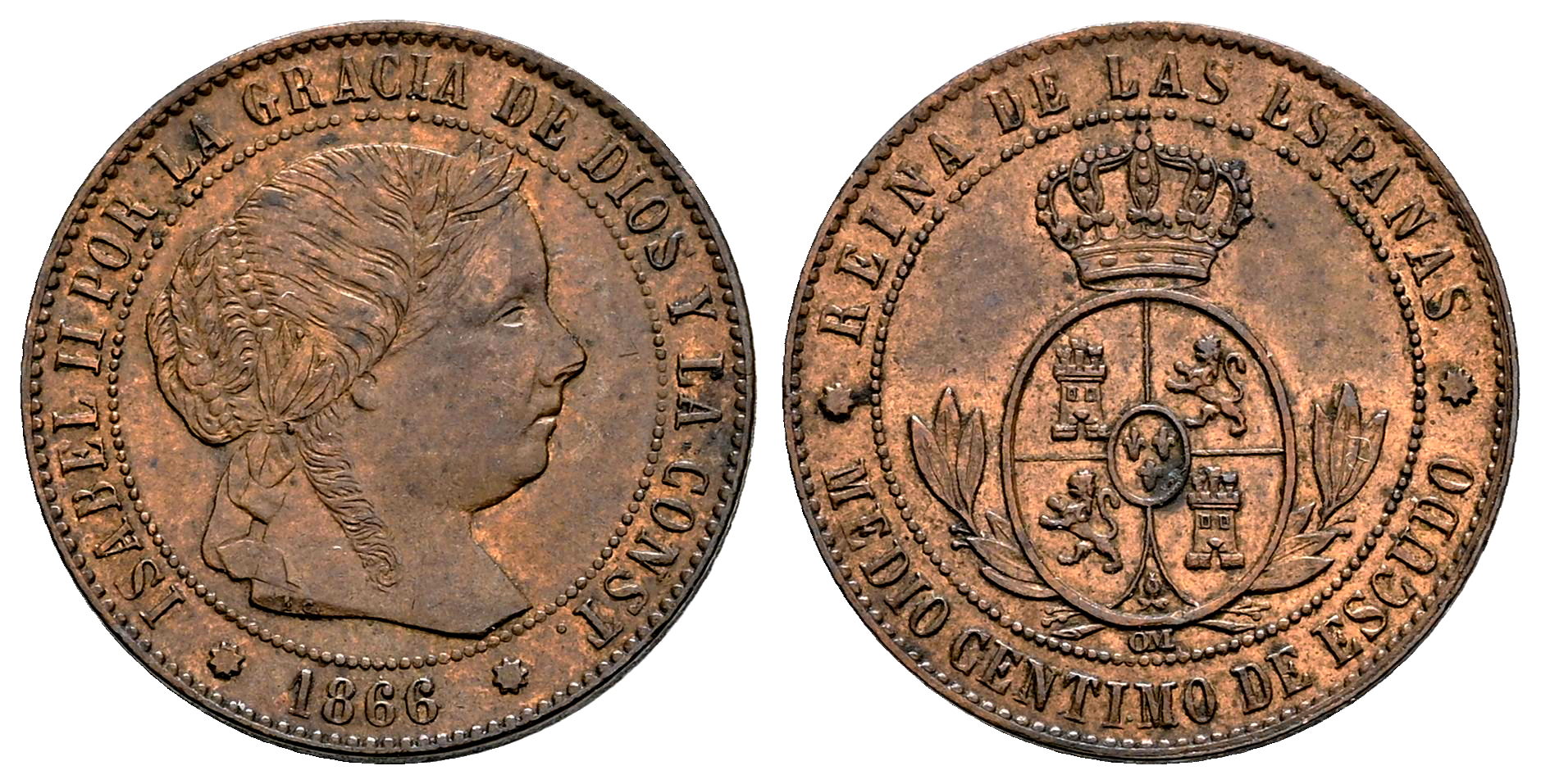 Elizabeth II (1833-1868). 1/2 centimo de escudo. 1866. Barcelona. OM. (Cal-201). Ae. 1,23 g. Almost XF/Choice VF. Est...25,00.