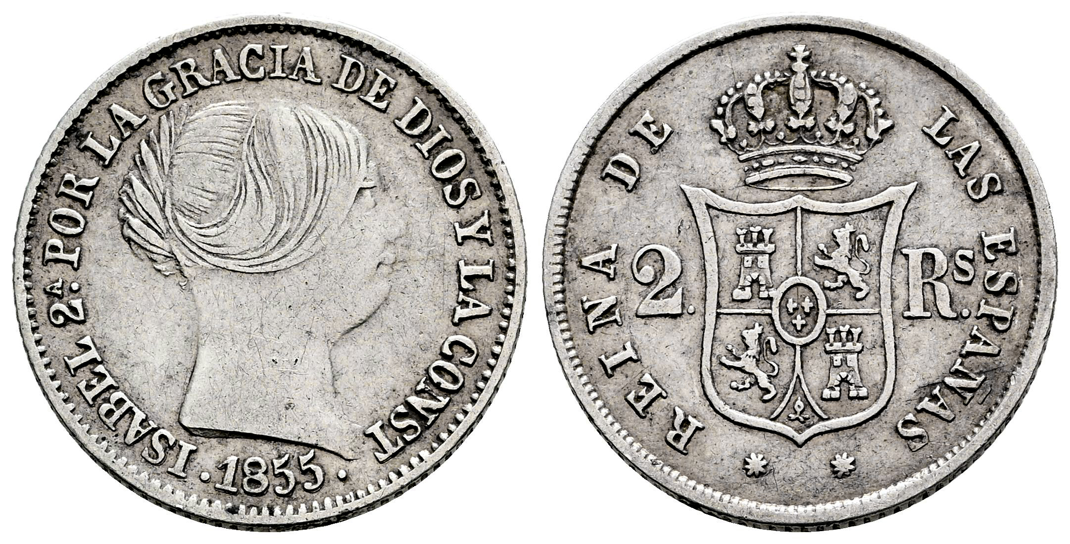Elizabeth II (1833-1868). 2 reales. 1855. Barcelona. (Cal-347). Ag. 2,65 g. Scarce. VF/Choice VF. Est...70,00.