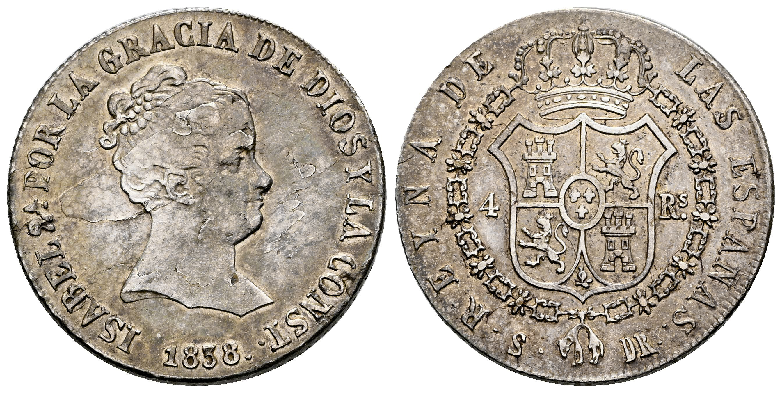 Elizabeth II (1833-1868). 4 reales. 1838. Sevilla. DR. (Cal-474). Ag. 5,76 g. Planchet flaws on obverse. Lightly toned. Almost XF. Est...150,00.