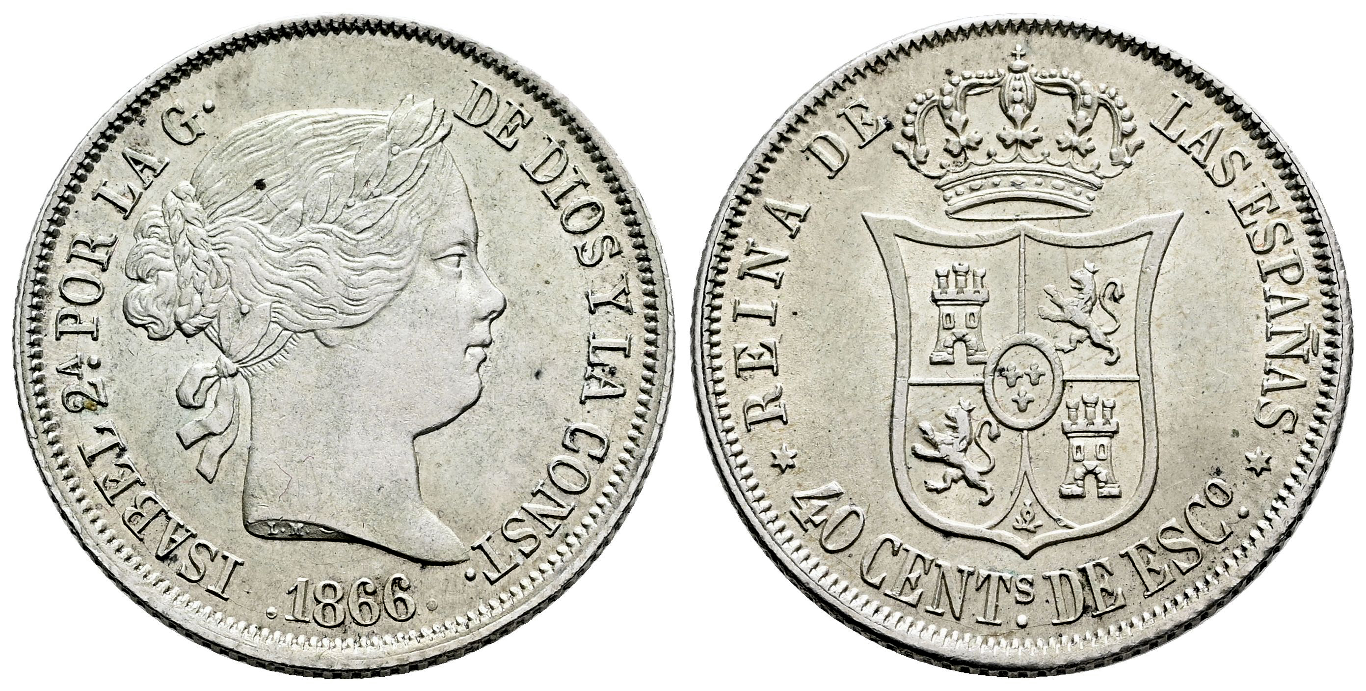 Elizabeth II (1833-1868). 40 centimos de escudo. 1866. Madrid. (Cal-501). Ag. 5,19 g. XF. Est...60,00.