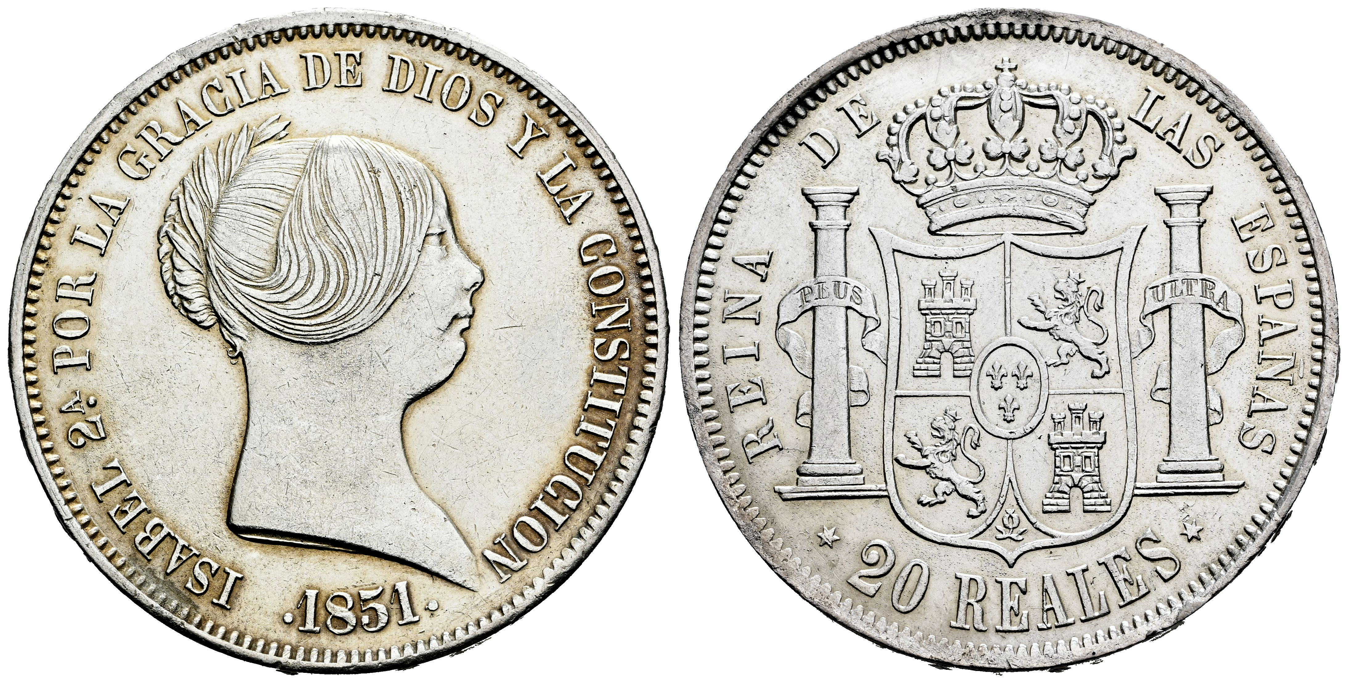 Elizabeth II (1833-1868). 20 reales. 1851. Madrid. (Cal-593). Ag. 25,97 g. Cleaned. Choice VF. Est...100,00.