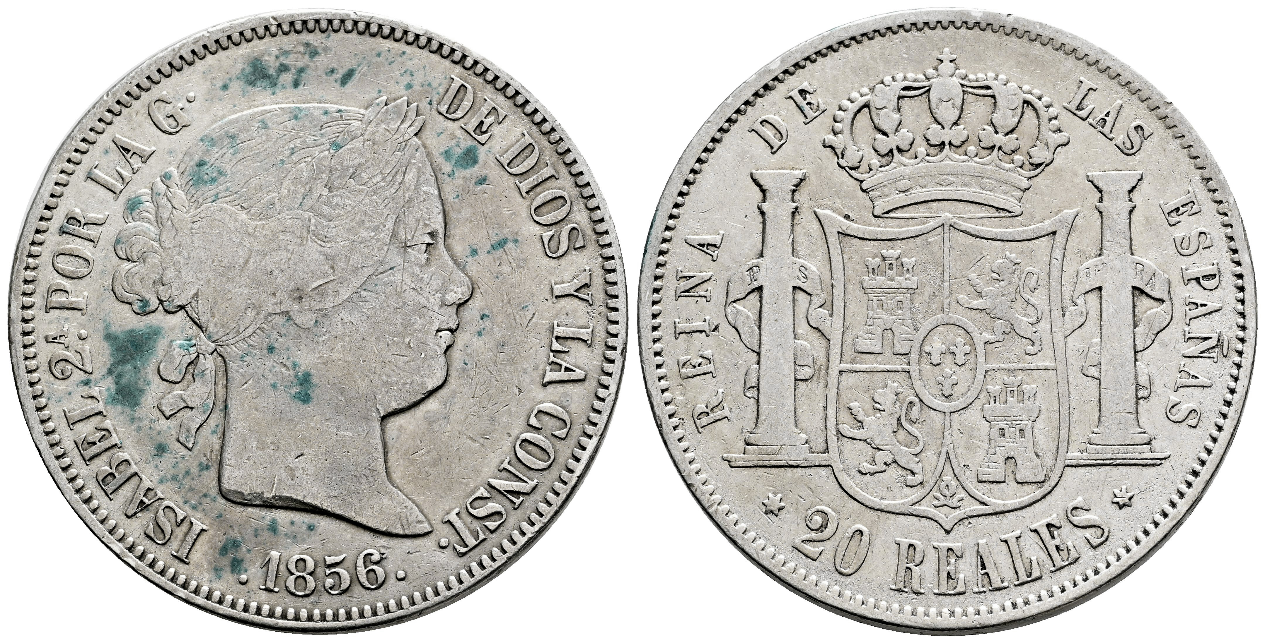 Elizabeth II (1833-1868). 20 reales. 1856. Madrid. (Cal-612). Ag. 25,69 g. Stains on obverse. Almost VF. Est...100,00.