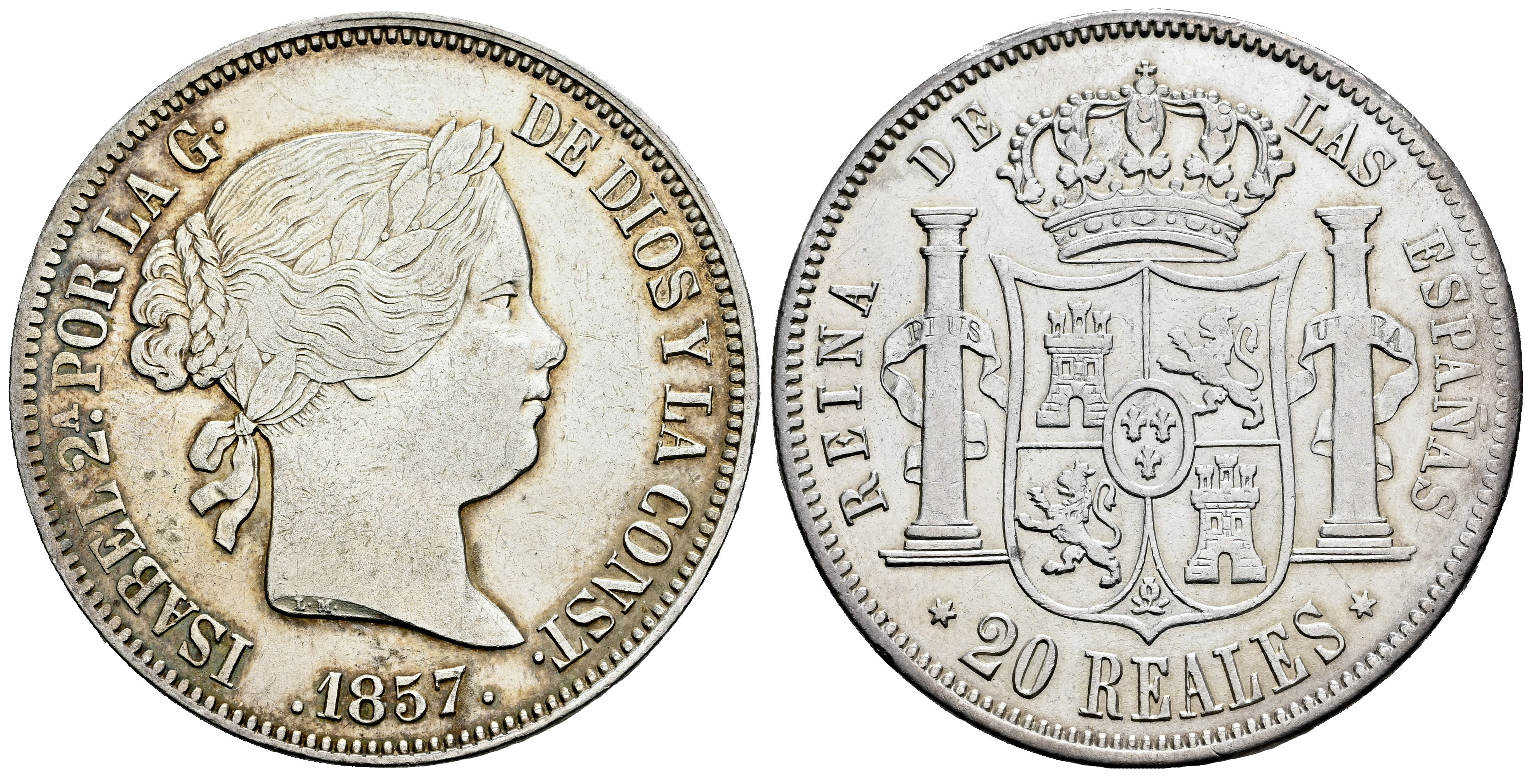 Elizabeth II (1833-1868). 20 reales. 1857. Madrid. (Cal-614). Ag. 25,80 g. Cleaned. Choice VF/VF. Est...75,00.