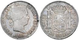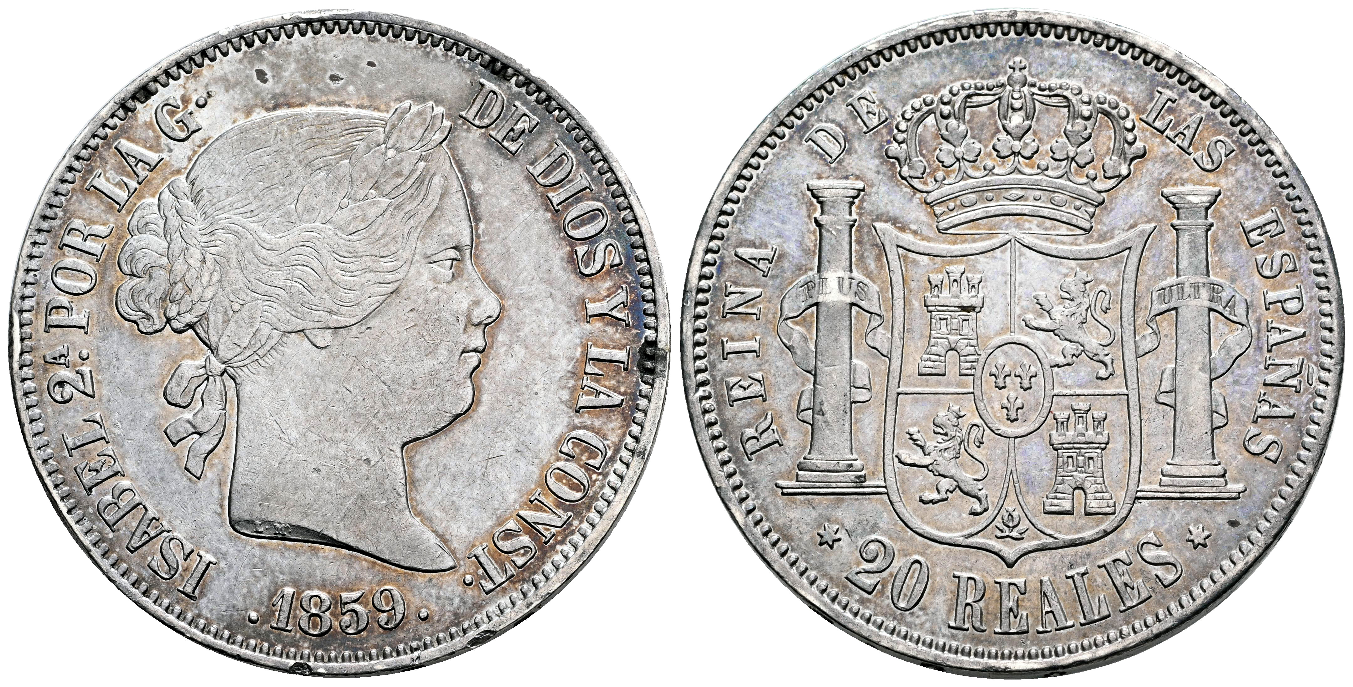 Elizabeth II (1833-1868). 20 reales. 1859. Madrid. (Cal-616). Ag. 25,89 g. Minor nicks on edge. Minimal hairlines. Sligthly iridiscent tone. Choice VF. Est...220,00.