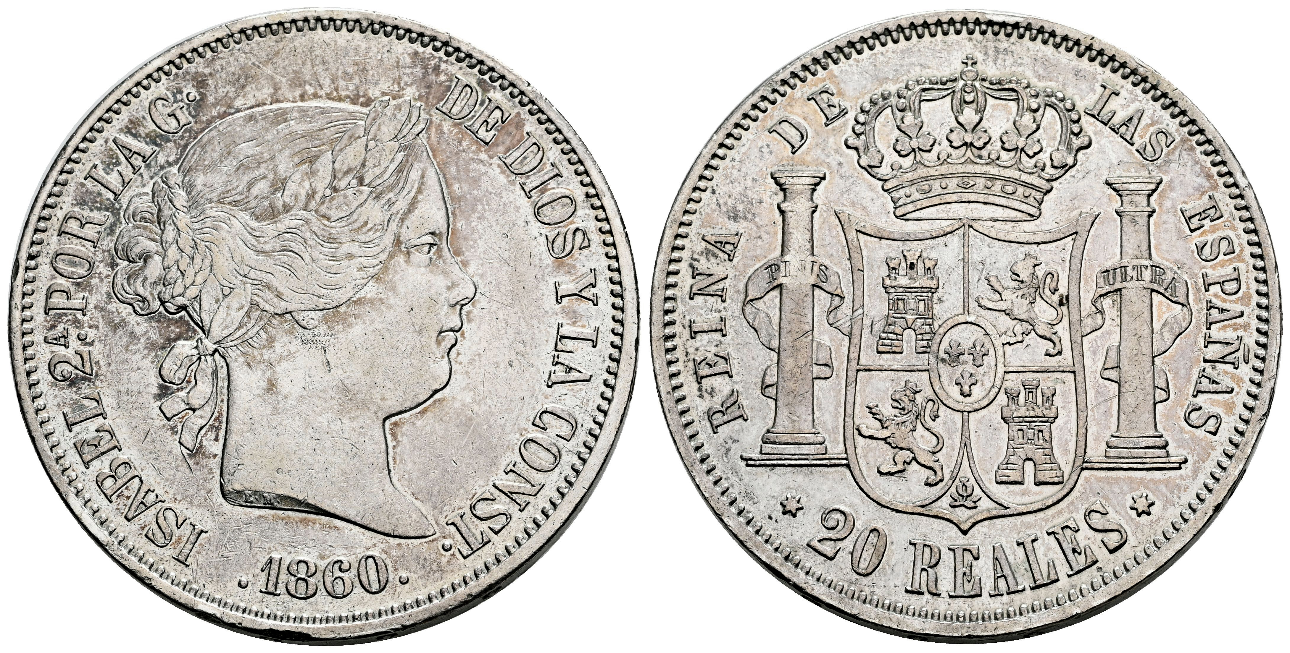 Elizabeth II (1833-1868). 20 reales. 1860. Madrid. (Cal-617). Ag. 25,88 g. Cleaned. Choice VF. Est...150,00.