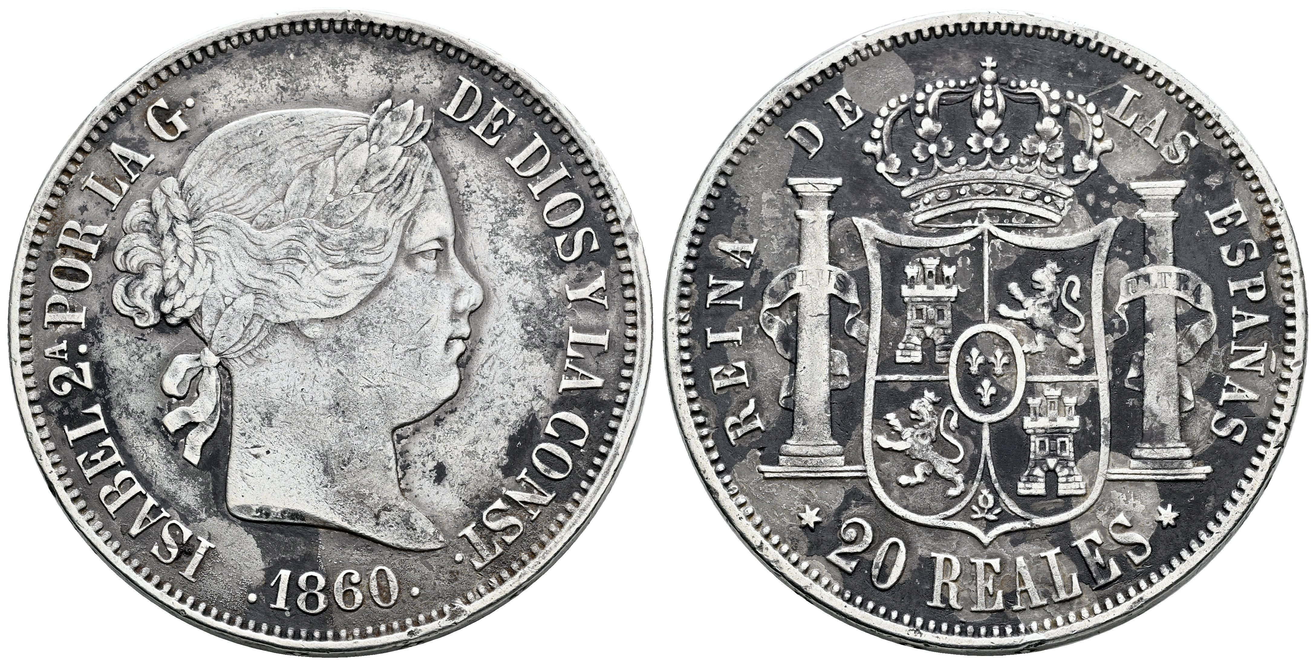Elizabeth II (1833-1868). 20 reales. 1860. Madrid. (Cal-617). Ag. 25,83 g. Cleaned. Irregular patina. VF. Est...120,00.