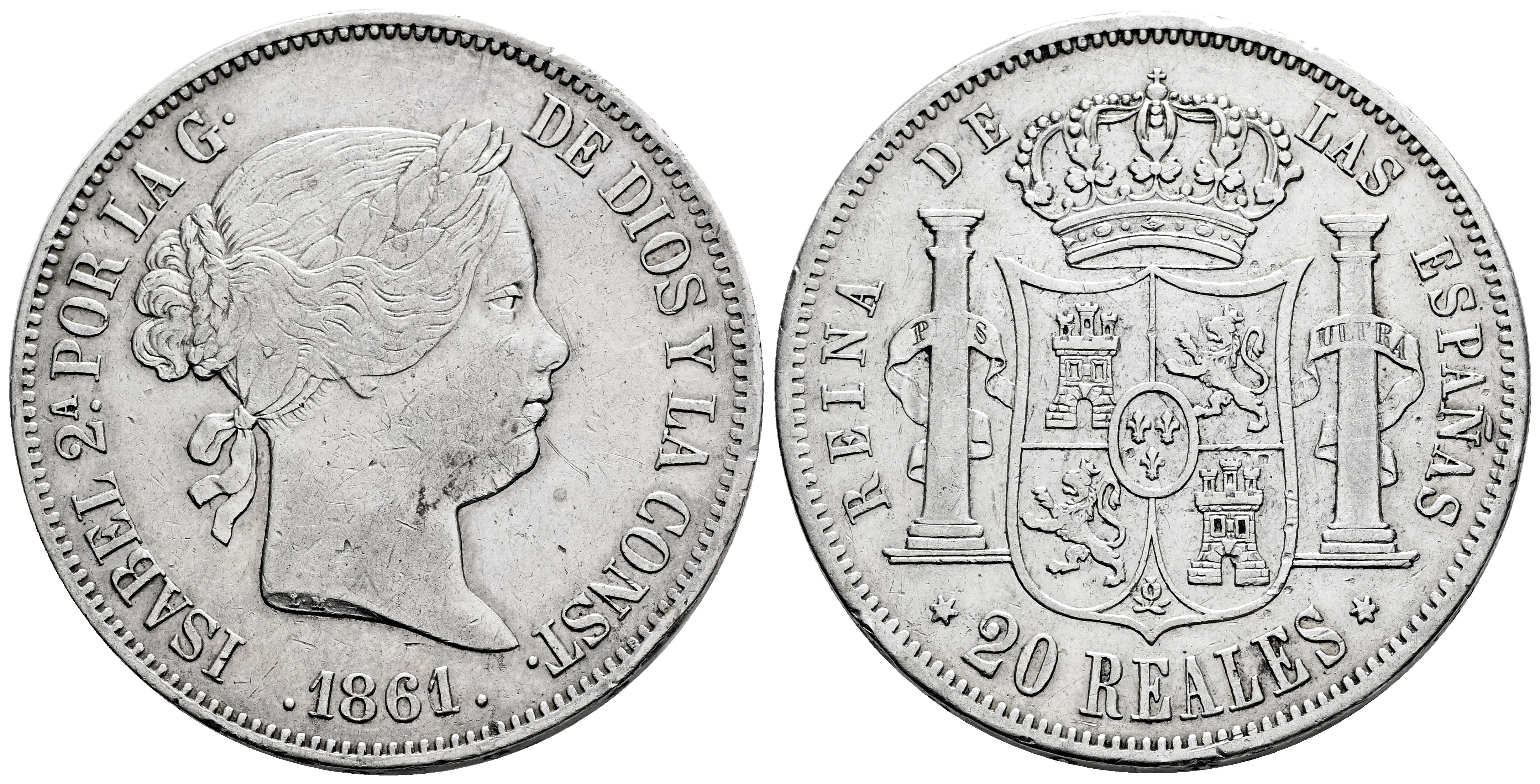 Elizabeth II (1833-1868). 20 reales. 1861/0. Madrid. (Cal-618). Ag. 25,72 g. Clear overdate. Minor nicks on edge. VF/Choice VF. Est...150,00.