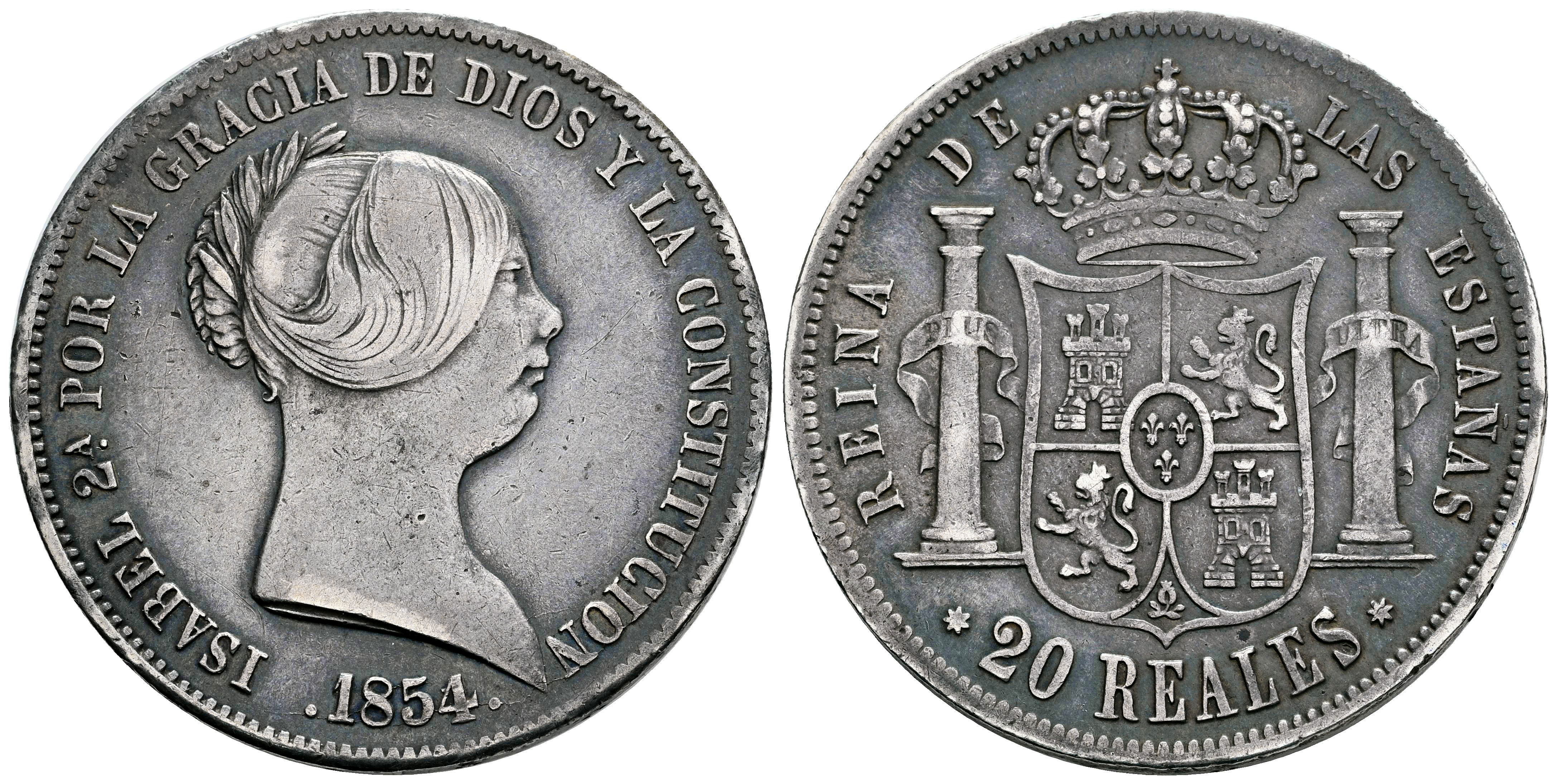 Elizabeth II (1833-1868). 20 reales. 1854. Sevilla. (Cal-629). Ag. 25,98 g. Patina. Minimal hairlines. Choice VF. Est...170,00.