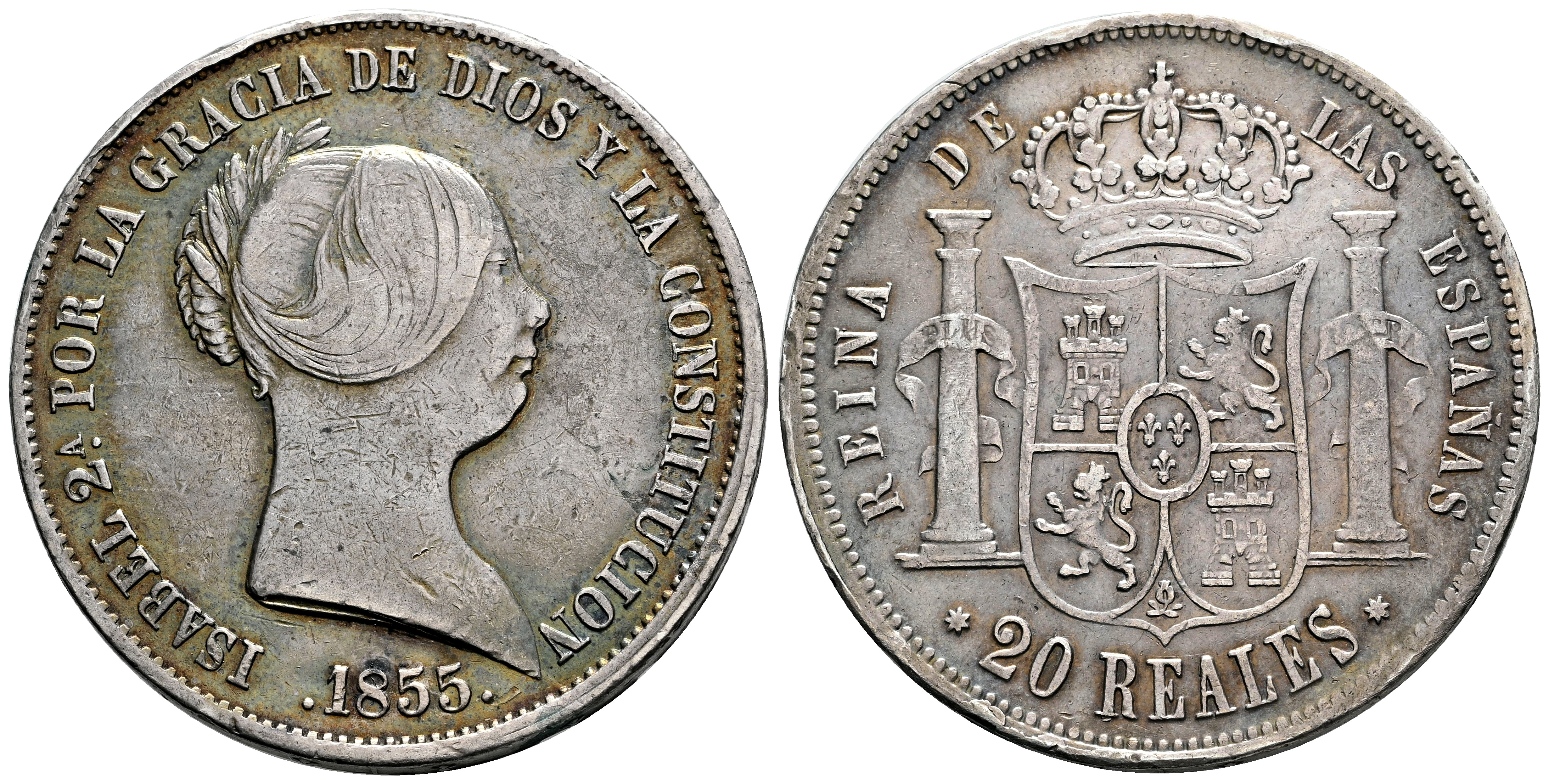 Elizabeth II (1833-1868). 20 reales. 1855. Sevilla. (Cal-632). Ag. 25,76 g. Delicate cleaning. Minor nicks on edge. Lightly toned. Choice VF. Est...150,00.
