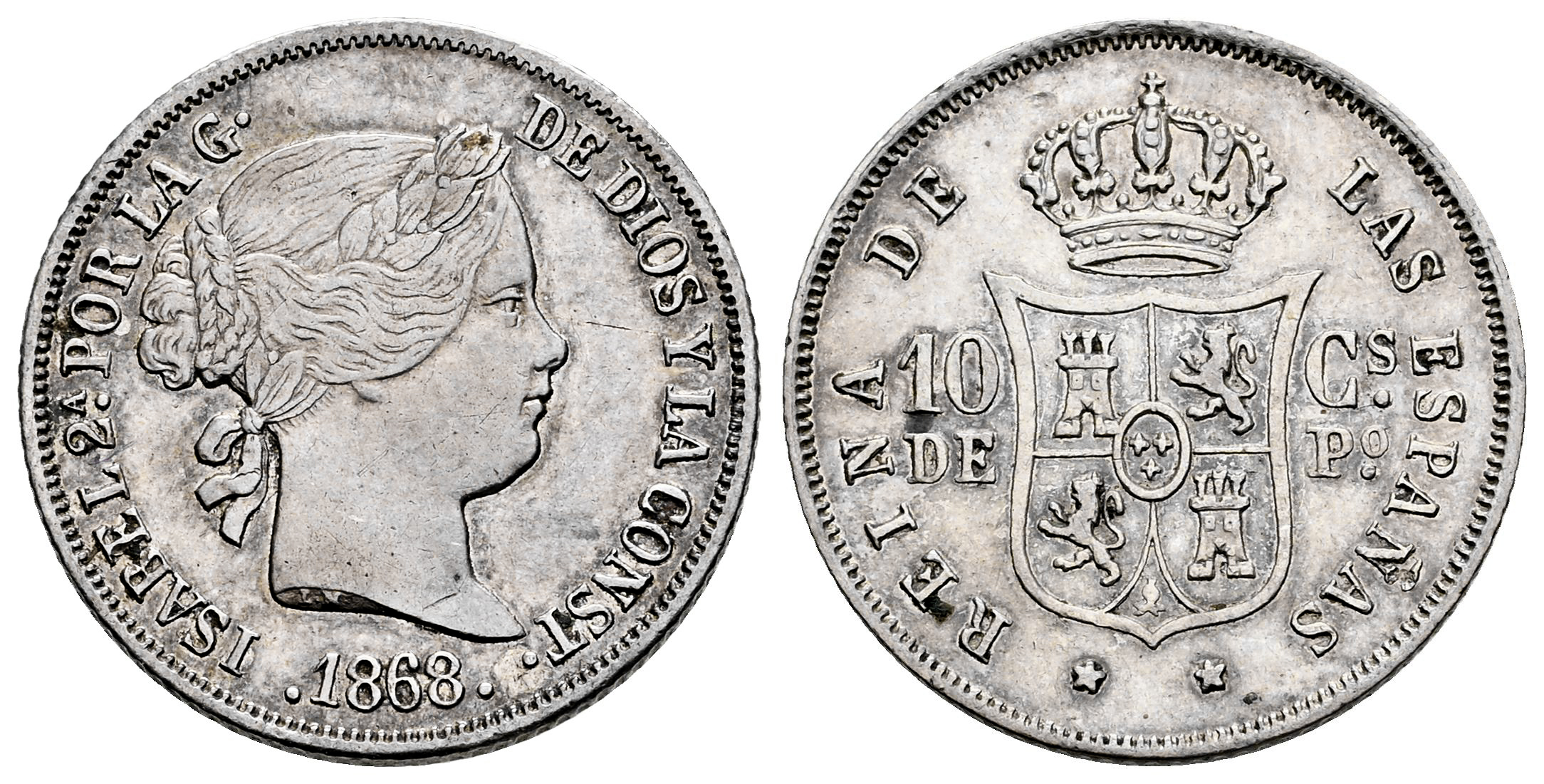 Elizabeth II (1833-1868). 10 centavos. 1868. Manila. (Cal-656). Ag. 2,53 g. Slight patina. Choice VF. Est...60,00.