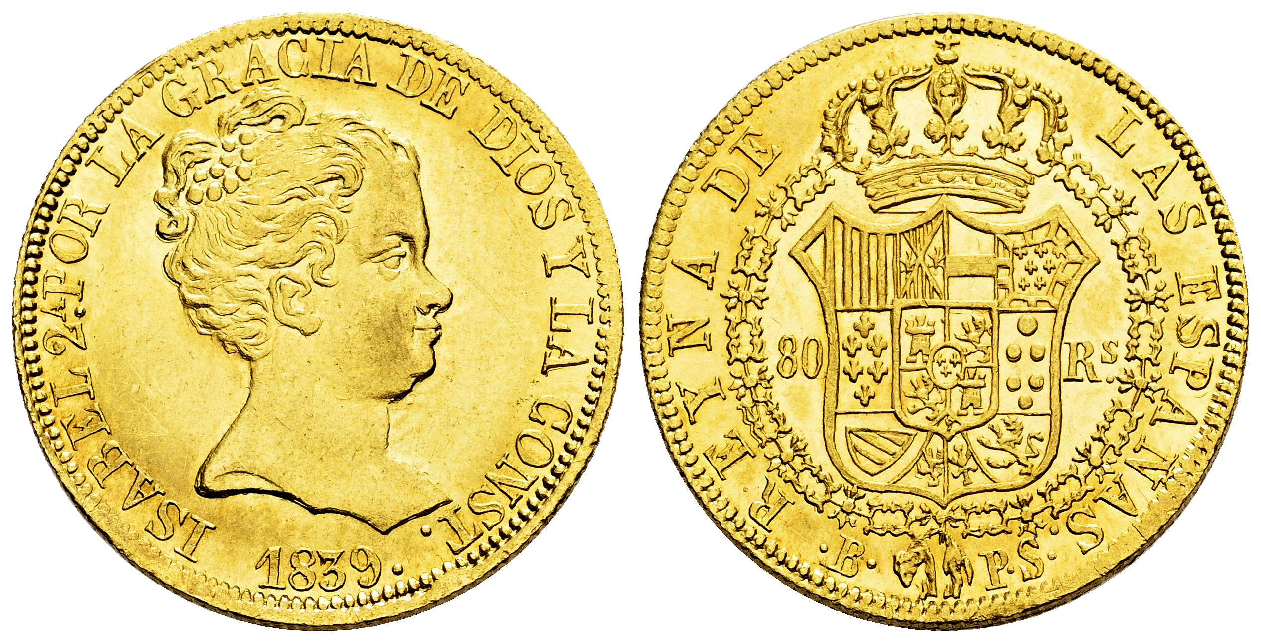 Elizabeth II (1833-1868). 80 reales. 1839. Barcelona. PS. (Cal-704). Au. 6,76 g. Minimal hairlines on obverse. Mint state. Est...900,00.
