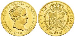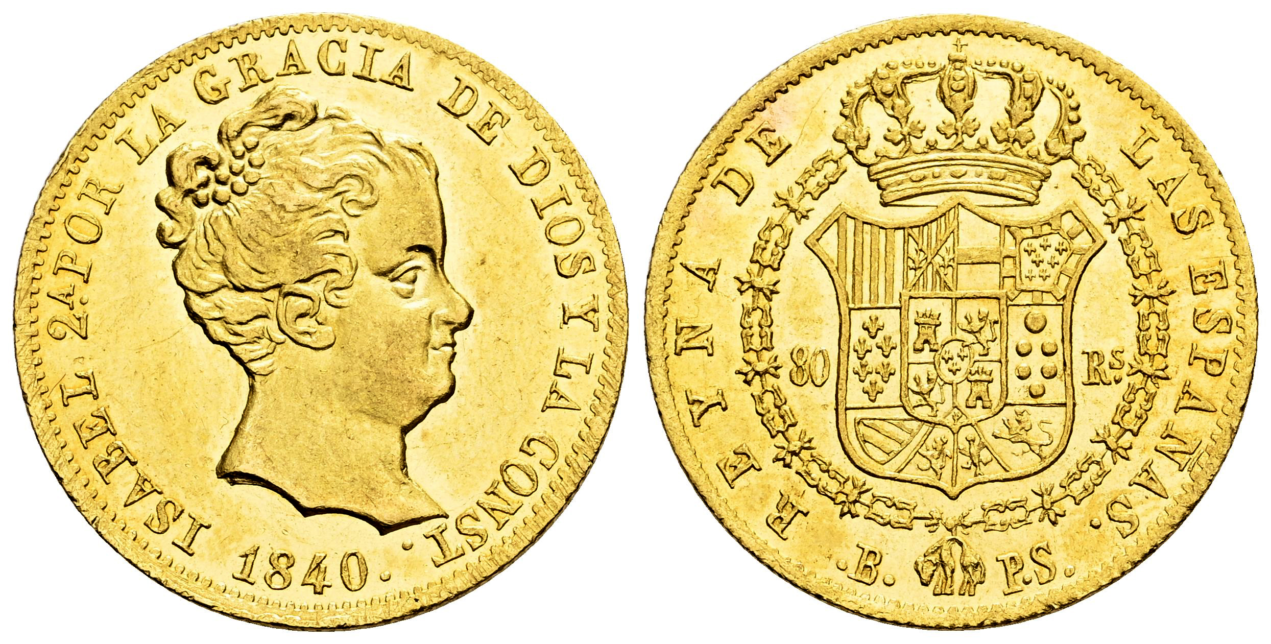 Elizabeth II (1833-1868). 80 reales. 1840. Barcelona. PS. (Cal-705). Au. 6,76 g. Plenty of original luster. Mint state. Est...900,00.