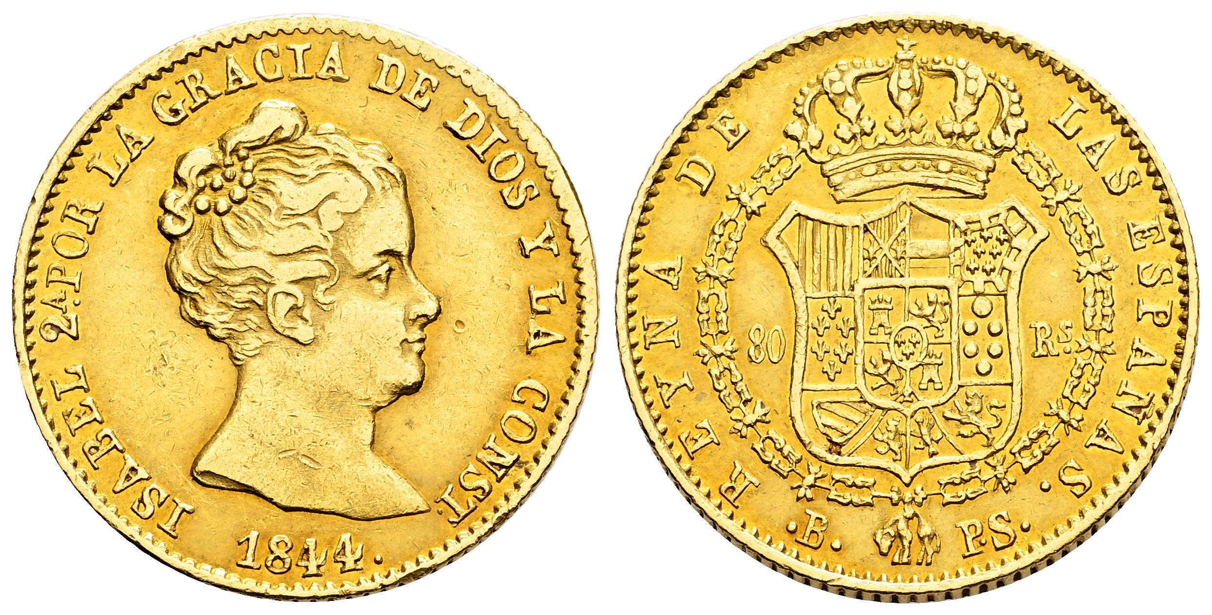 Elizabeth II (1833-1868). 80 reales. 1844. Barcelona. PS. (Cal-711). Au. 6,70 g. Nice color. Choice VF/Almost XF. Est...600,00.