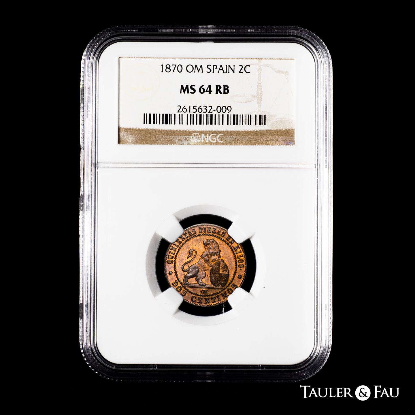 Centenary of the Peseta (1868-1931). Provisional Government (1868-1871). 2 centimos. 1870. Barcelona. OM. (Cal-4). Ae. Original luster. Slabbed by NGC as MS 64 RB. Est...120,00.