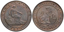 Centenary of the Peseta (1868-1931). Provisional Government (1868-1871). 10 centimos. 1870. Barcelona. OM. (Cal-8). Ae. 10,15 g. Nice color. Ex Áureo&Calicó (18/10/2018), lot 1894. Almost MS. Est...250,00.