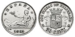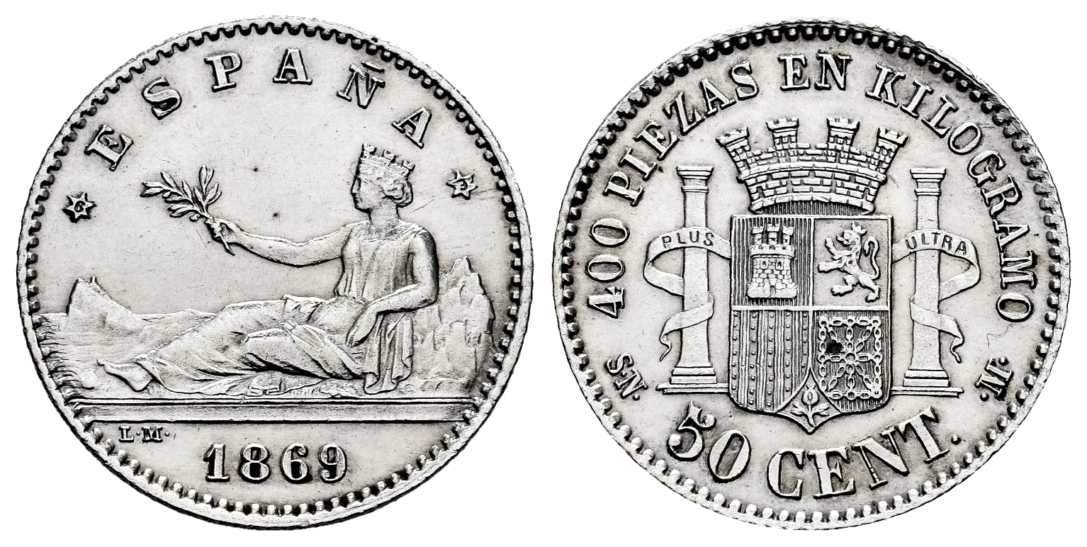 Centenary of the Peseta (1868-1931). Provisional Government (1868-1871). 50 centimos. 1869*9-6. Madrid. SNM. (Cal-13). Ag. 2,45 g. Scratch on obverse. Slightly cleaned. Surface hairlines. Scarce in this grade. XF. Est...250,00.
