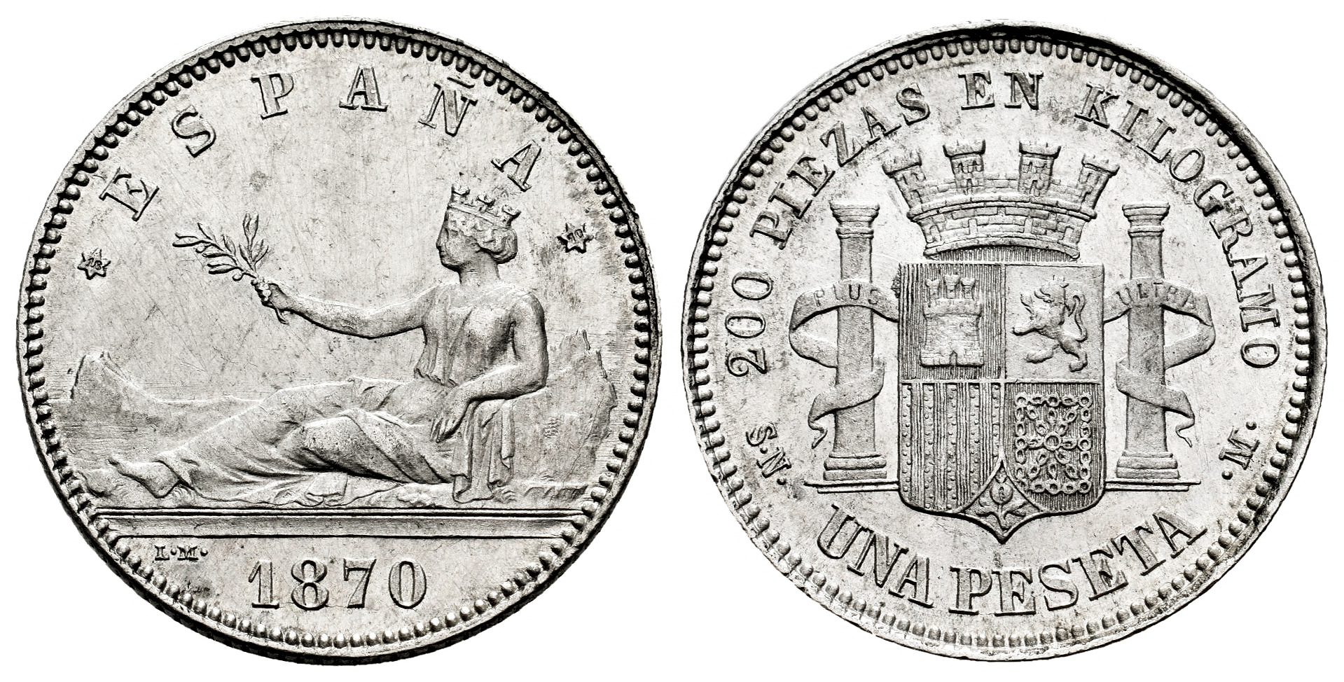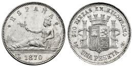 Centenary of the Peseta (1868-1931). Provisional Government (1868-1871). 1 peseta. 1870*18-70. Madrid. SNM. (Cal-18). Ag. 5,01 g. Original luster. Minimal hairlines. Scarce in this grade. AU. Est...220,00.