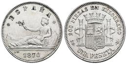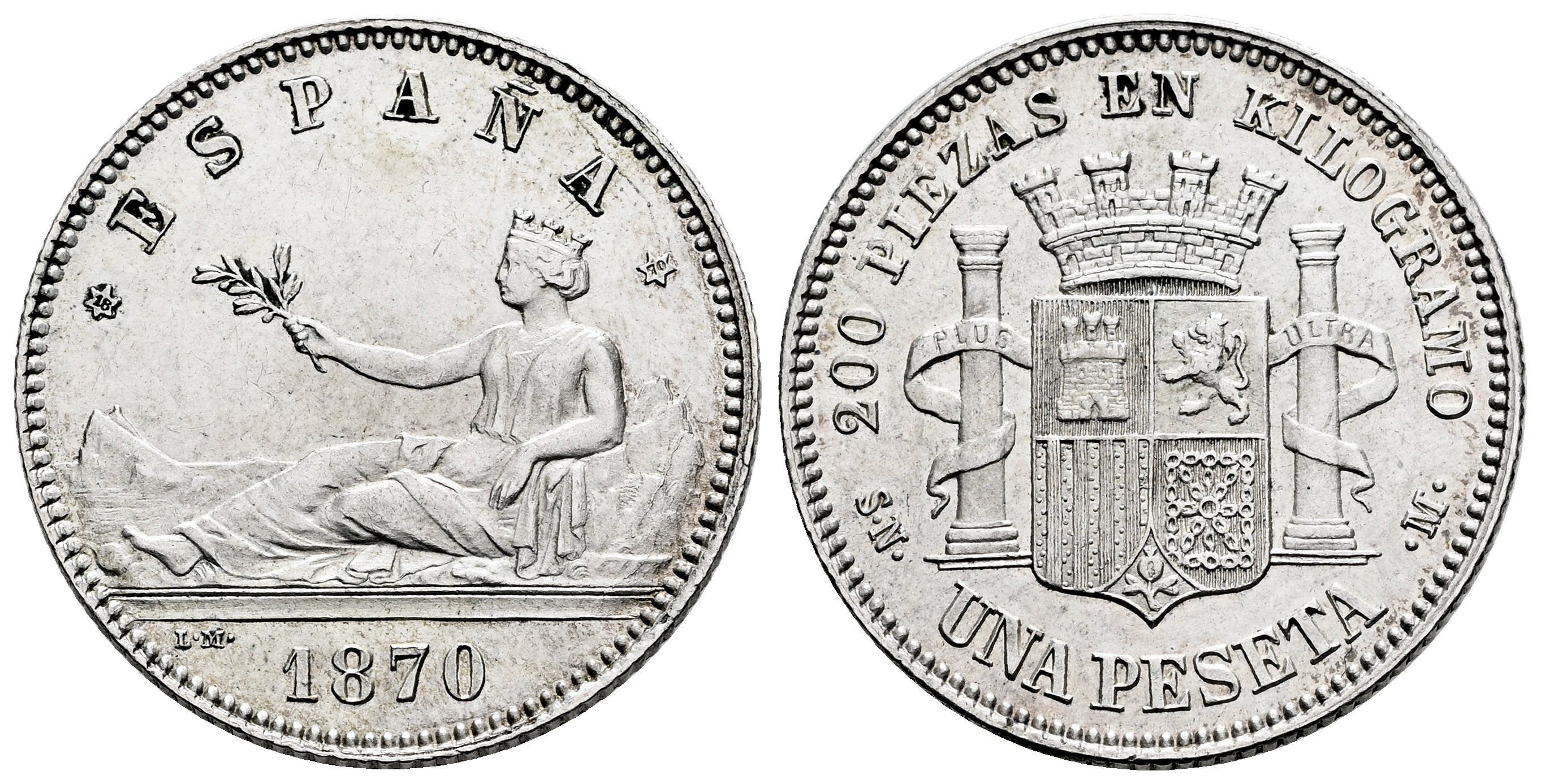 Centenary of the Peseta (1868-1931). Provisional Government (1868-1871). 1 peseta. 1870*18-70. Madrid. SNM. (Cal-18). Ag. 4,97 g. Nice strike with traces of luster. Rare in this grade. Ex Soler&Llach (25/10/2018), lot 11. Almost MS. Est...1000,00.