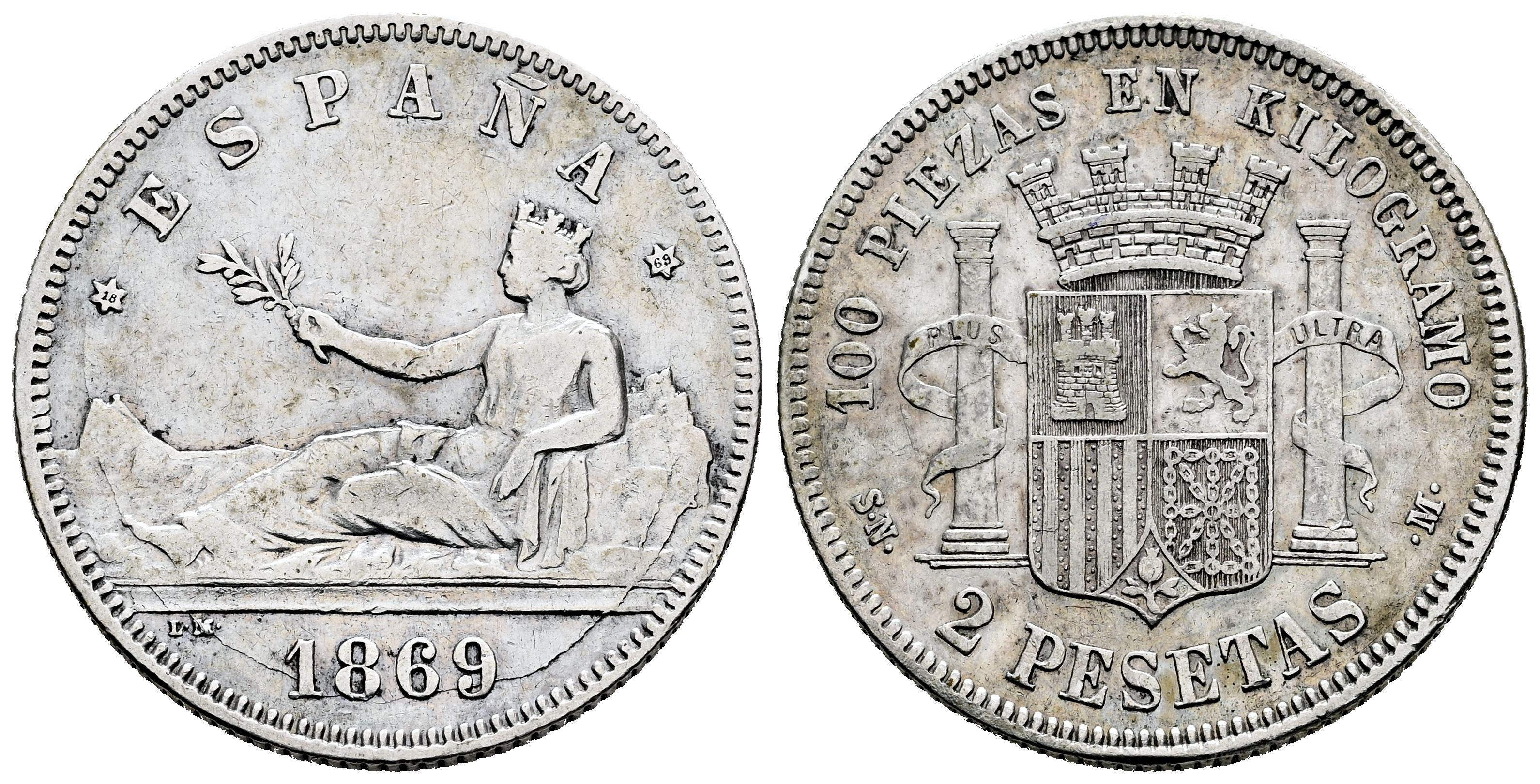 Centenary of the Peseta (1868-1931). Provisional Government (1868-1871). 2 pesetas. 1869*18-69. Madrid. SNM. (Cal-22). Ag. 9,93 g. Almost VF/VF. Est...60,00.