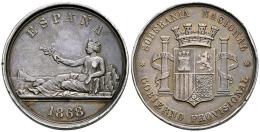 Centenary of the Peseta (1868-1931). Provisional Government (1868-1871). Silver medal. 1868. Madrid. (Cal-36). Ag. 24,29 g. Silver medal that served as a model for the 5 pesetas silver coin of 1869 and 1870. Engraver: Luis Marchionni. Minor nick on edge. Patina. Almost XF/Choice VF. Est...300,00.