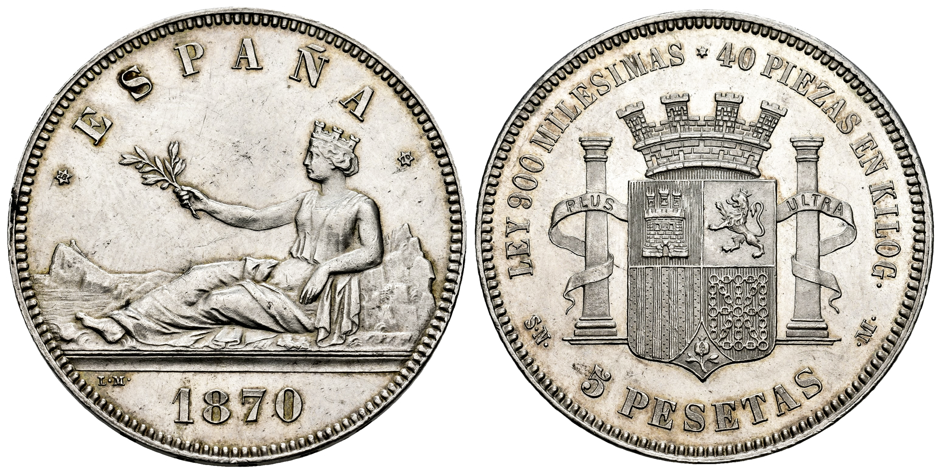 Centenary of the Peseta (1868-1931). Provisional Government (1868-1871). 5 pesetas. 1870*18-70. Madrid. SNM. (Cal-39). Ag. 25,05 g. Original luster. Minimal hairlines. Scarce in this grade. AU. Est...600,00.