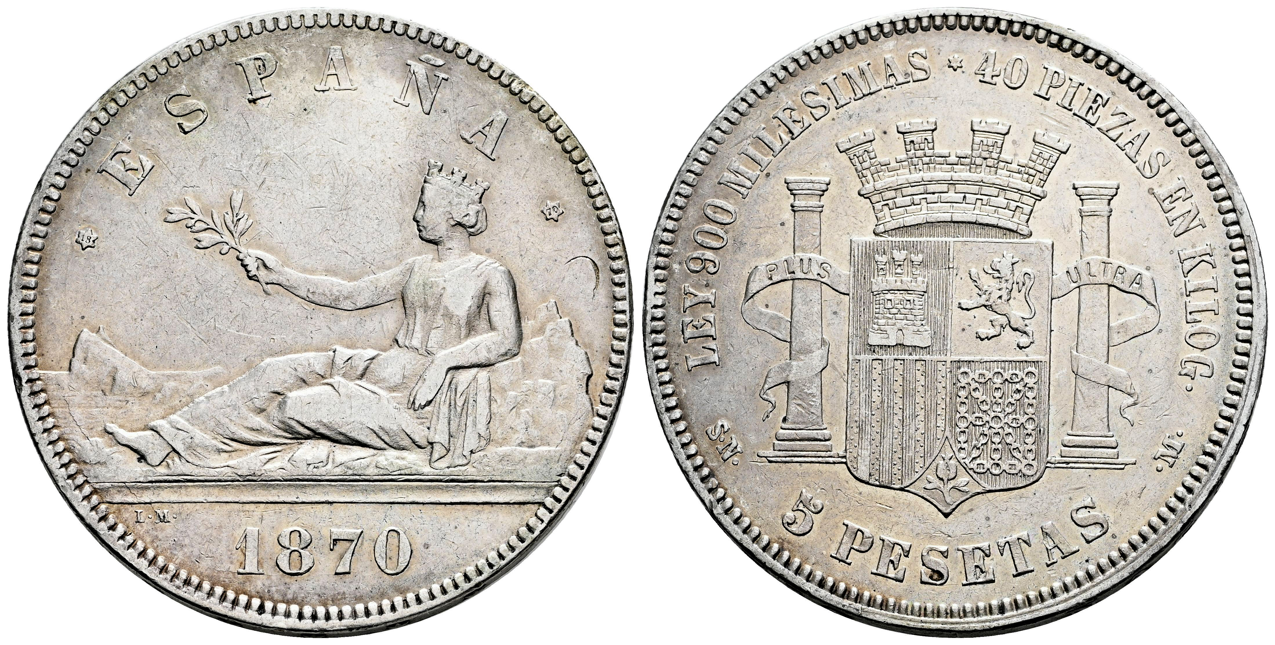 Centenary of the Peseta (1868-1931). Provisional Government (1868-1871). 5 pesetas. 1870*18-70. Madrid. SNM. (Cal-39). Ag. 25,01 g. Faint scratches. Choice VF. Est...60,00.