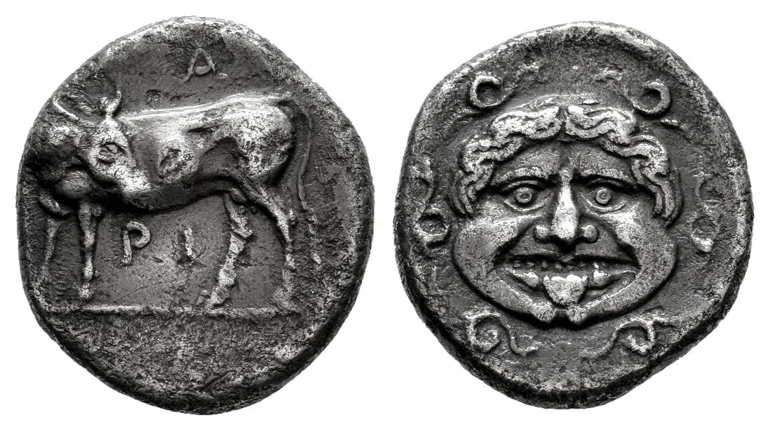 Mysia. Parion. Hemidrachm. Circa 4th century BC. (Bmc-14/16). (Sng Bnf-1356/57). Anv.: Bull standing to left, head reverted; (Π)A above, PI below. Rev.: Facing gorgoneion with protruding tongue, serpents around. Ag. 2,24 g. Patina. Choice VF. Est...90,00.