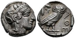Attica. Athens. Tetradrachm. 454-404 BC. (Kroll-8). (Sng Cop-31). (Hgc-4, 1597). Anv.: Head of Athena to right, wearing crested Attic helmet ornamented with three olive leaves above visor and spiral palmette on bowl, round earring with central boss and pearl necklace. Rev.: Owl standing to right with head facing, olive sprig and crescent behind, ΑΘΕ before; all within incuse square. Ag. 16,95 g. Lightly toned. Minor hairlines. Ex Wayne Scheible collection, Classical Numismatic Group 557 (06/03/2024), lot 60. Included original label. Choice VF. Est...700,00.