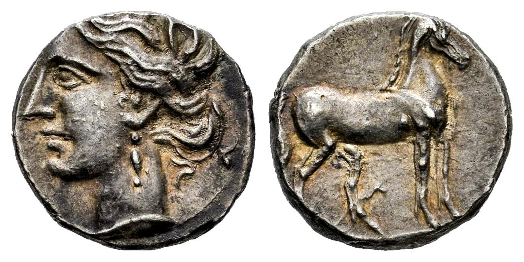 North Africa. Carthage. 1/4 shekel. 215-205 BC. Carthage or uncertain Punic mint in Bruttium. Second Civil War. (Jenkins-L2). (HN Italy-2020). (Sng Cop-335). Anv.: Wreathed head of Tanit to left. Rev.: Horse standing to right.. Ag. 1,73 g. Light tone with golden highlights. Beautiful. Almost XF/XF. Est...400,00.