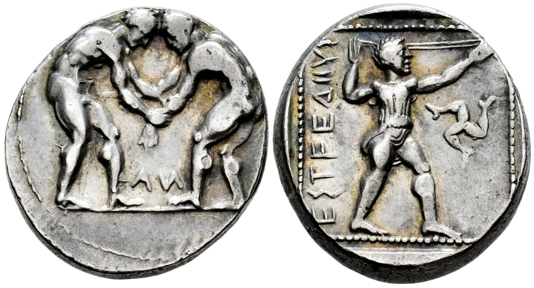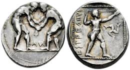 Pamphylia. Aspendos. Stater. 380/75-330/25 BC. (Tekin-Series 4). (SNG von Aulock-4554). Anv.: Two nude wrestlers, standing and grappling with each other; between them, AИ. Rev.: ΕΣΤFΕΔΙΙΥΣ. Slinger standing right; to right, triskeles running left; all within dotted square border. Ag. 10,97 g. Attractive specimen. Slight iridescent tone. Choice VF/Almost XF. Est...600,00.