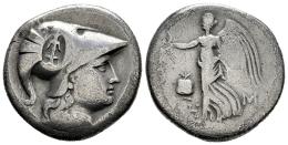 Pamphylia. Side. Tetradrachm. 205-100 BC. Dem- Magistrate. (SNG BnF-684). Anv.: Head of Athena to right, wearing crested Corinthian helmet. Rev.: Nike advancing to left, holding wreath; pomegranate to left, ΔH-M across fields. Ag. 16,01 g. Countermark Seleukid anchor within incuse oval punch. Almost VF/Choice F. Est...250,00.