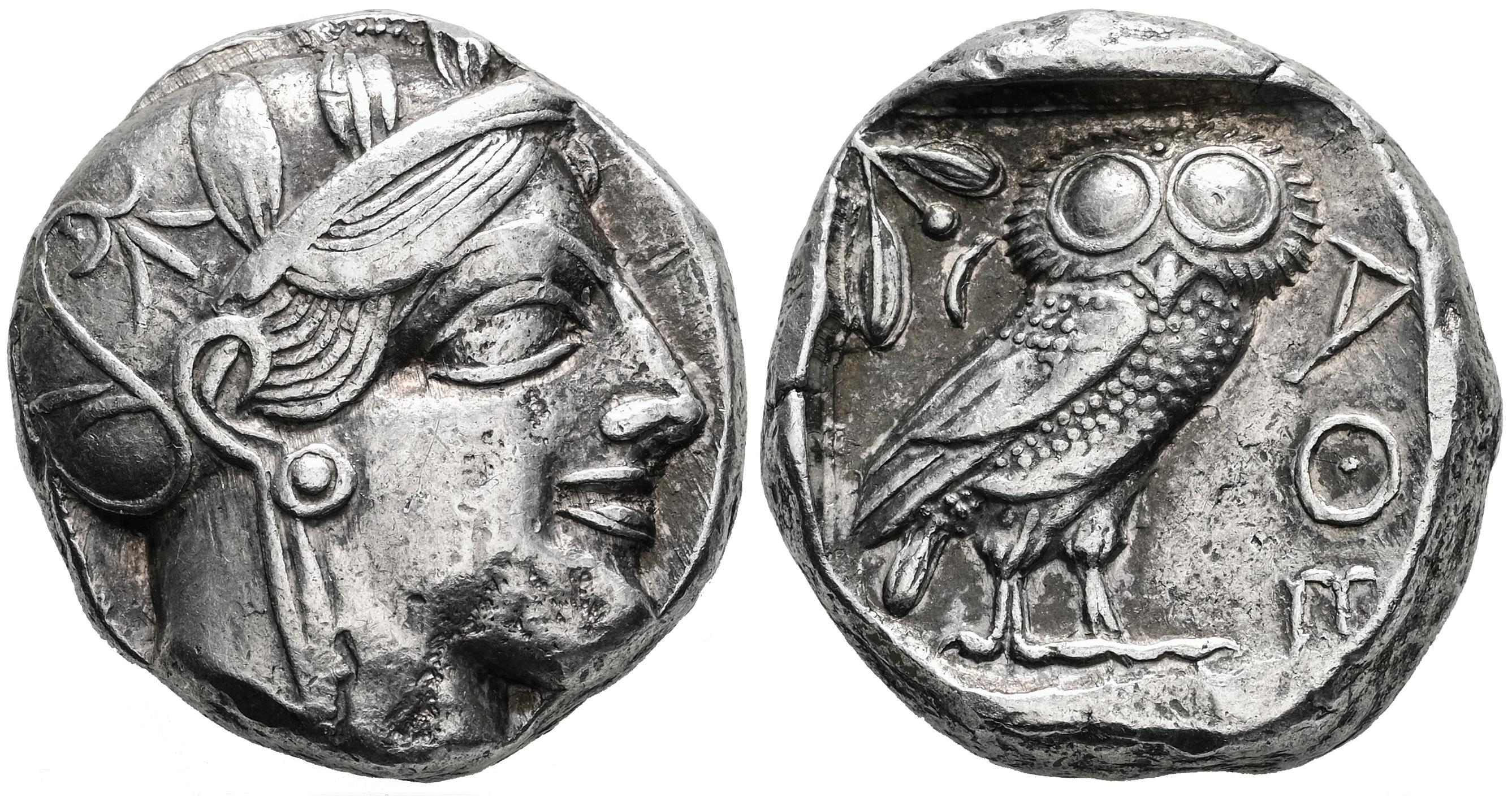 Attica. Athens. Tetradrachm. 454-404 BC. (Gc-2526). (Sng Cop-31). (Kroll-8). Anv.: Head of Athena right, wearing crested Attic helmet ornamented with three olive leaves above visor and spiral palmette on bowl. Rev.: Owl standing to right with head facing, olive sprig and crescent behind, ΑΘΕ before; all within incuse square. Ag. 17,22 g. VF/Choice VF. Est...600,00.
