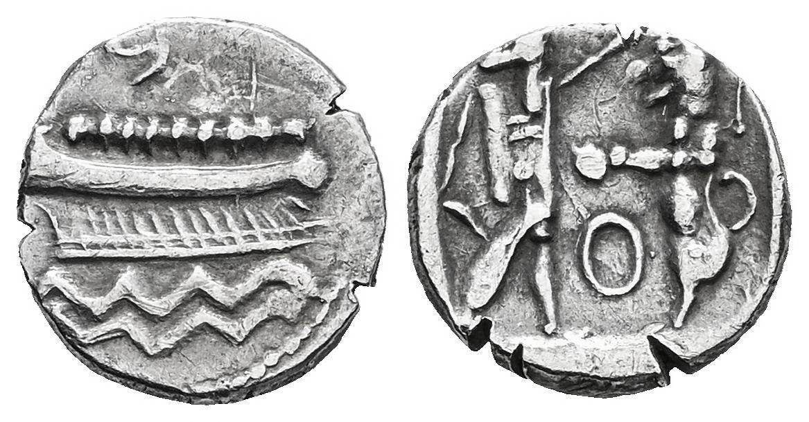 Phoenician. Ba`alšillem (Sakton) II. 1/16 shekel. 401-365 BC. Sidon. (E&E-S Group IV.1.3.c). (Hgc-10, 240). Anv.: Phoenician galley to left; Phoenician B above, waves below. Rev.: Persian king or hero, holding dagger and standing to right, fighting lion standing to left on its hind legs; O between; all within incuse square. Ag. 0,67 g. Choice VF. Est...100,00.