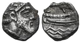 Phoenician. Arados. Obol. 400-350 BC. (Traité-II 844-845, pl. CXVI, 29-31). (Sng Cop-19/22). (Hgc-10, 46). Anv.: Laureate and bearded head of Ba'al-Arwad to right. Rev.: Galley to right; waves below, Phoenician letters 'mem' and 'aleph' above. Ag. 0,84 g. Original Patina. VF/Choice VF. Est...100,00.