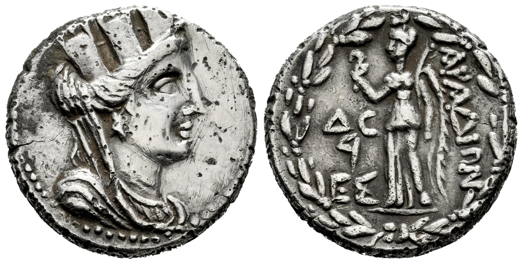 Phoenicia. Arados. Tetradrachm. 96-95 BC. (Sng Cop-50v). Anv.: Turreted, veiled and draped bust of Tyche to right. Rev.: ΑΡΑΔΙΩΝ, Nike standing facing, head to left, holding aplustre and palm; ΔC (date) over Phoenician letter above ΕΣ; all within wreath. Ag. 14,74 g. Tooled and smoothed on the obverse. VF/Choice VF. Est...250,00.
