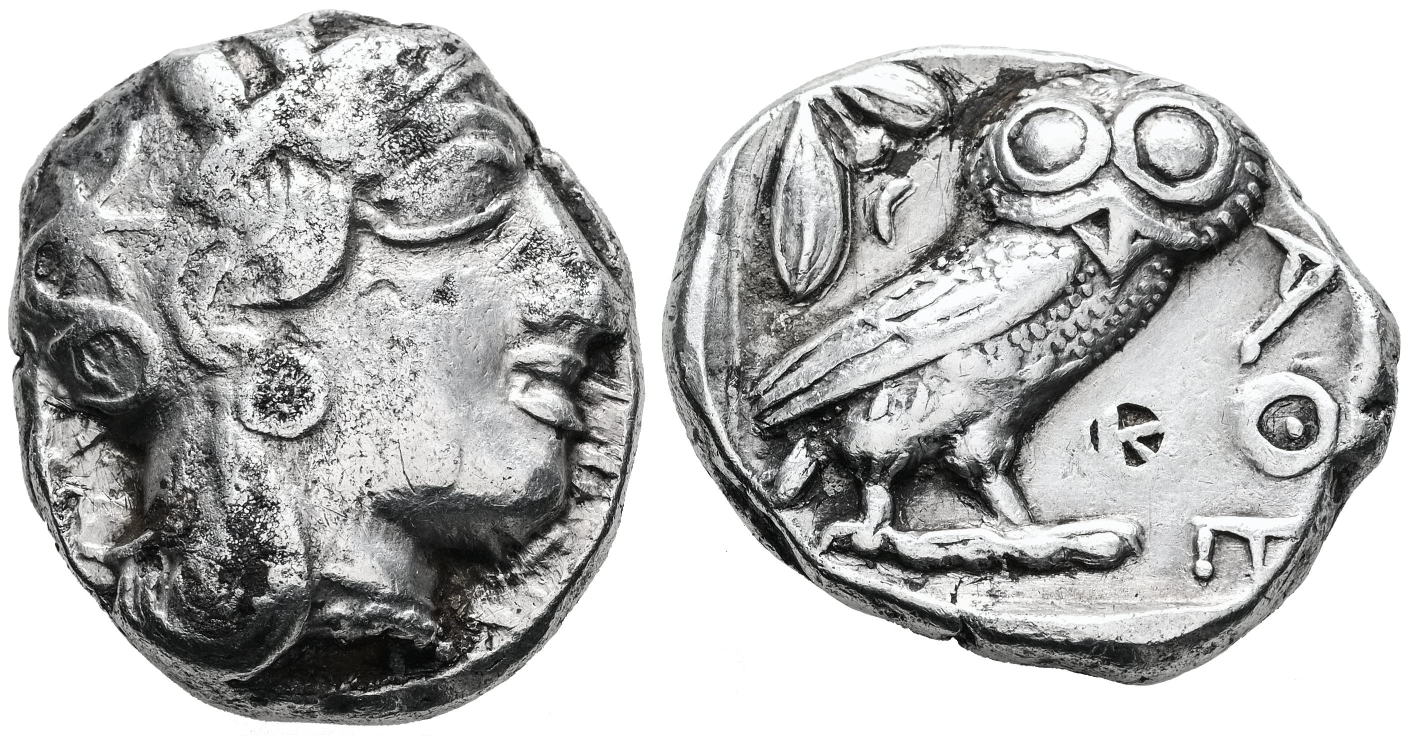 Attica. Athens. Tetradrachm. 454-404 BC. (Kroll-8). (Dewing-1591/8). (Sng Cop-31). Anv.: Head of Athena to right, wearing crested Attic helmet ornamented with three olive leaves above visor and spiral palmette on bowl, round earring with central boss, and pearl necklace. Rev.: Owl standing to right with head facing, olive sprig and crescent behind, ΑΘΕ before; all within incuse square. Ag. 18,84 g. Counterstamp on reverse. Almost VF/VF. Est...400,00.