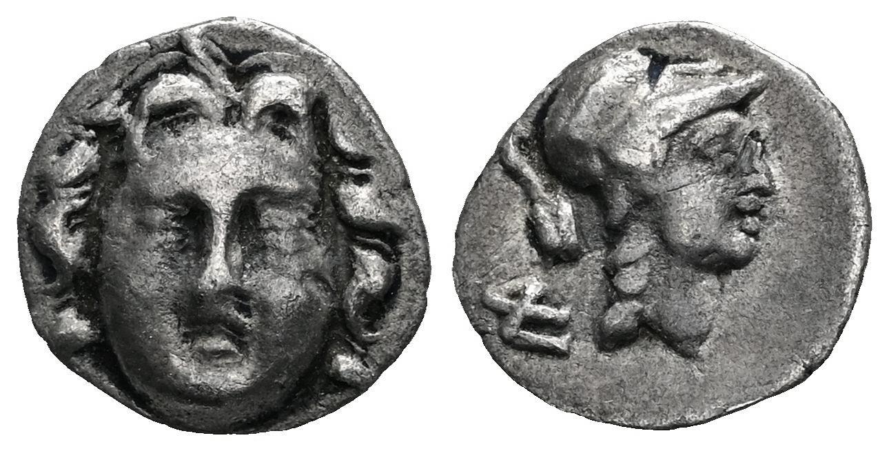 Pisidia. Selge. Obol. 350-300 BC. (Sng von Aulock-5280). Anv.: Facing gorgoneion with protruding tongue. Rev.: Head of Athena to right, wearing crested Attic helmet; behind, astragalos above monogram. Ag. 0,81 g. Slight patina. VF/Choice VF. Est...80,00.