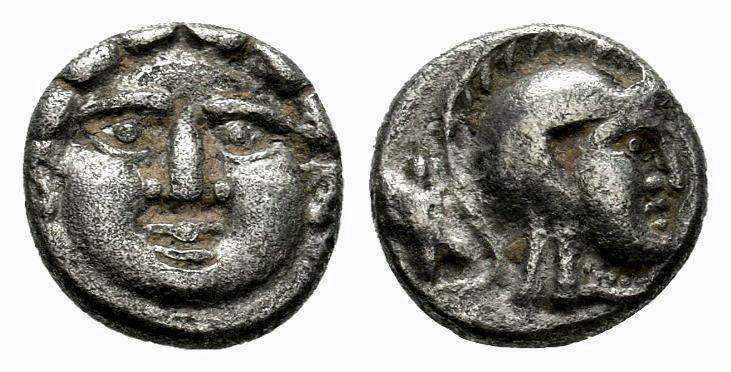 Pisidia. Selge. Obol. 250-190 BC. (Sng París-1951). (SNG von Aulock-5279). Anv.: Facing gorgoneion. Rev.: Head of Athena to right, wearing crested Attic helmet; behind, spear; to left, astragalos. Ag. 0,58 g. VF. Est...30,00.