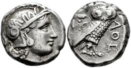 Attica. Athens. Tetradrachm. 353-294 BC. (Sng Cop-63). (Hgc-4, 1599). Anv.: Head of Athena to right, wearing earring, necklace, and crested Attic helmet decorated with three olive leaves over visor and a spiral palmette on the bowl. Rev.: Owl standing to right with head facing, olive sprig with berry and crescent in upper left field, AΘE to right; all within incuse square. Ag. 17,11 g. A good sample for this type. Choice VF. Est...650,00.