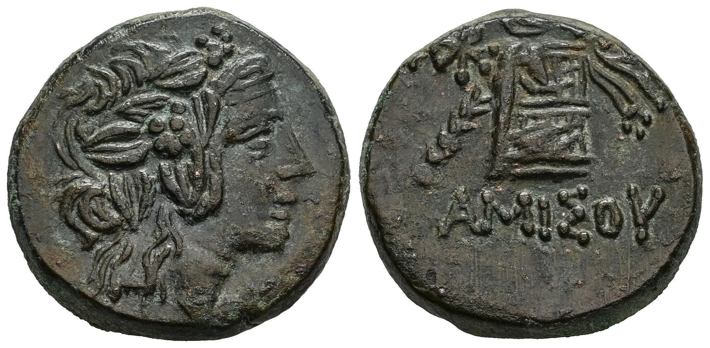 Pontos. Amisos. AE 20. 105-90 or 100-95 BC. Time of Mithradates VI Eupator. (SNG Stancomb-698). (SNG BM Black Sea-1205). (Hgc-7, 243). Anv.: Ivy-wreathed head of Dionysos to right. Rev.: Fileted thyrsos leaning against cista mystica draped with panther skin; monogram in left field, ΑΜIΣOY below. Ae. 8,76 g. Choice VF. Est...60,00.