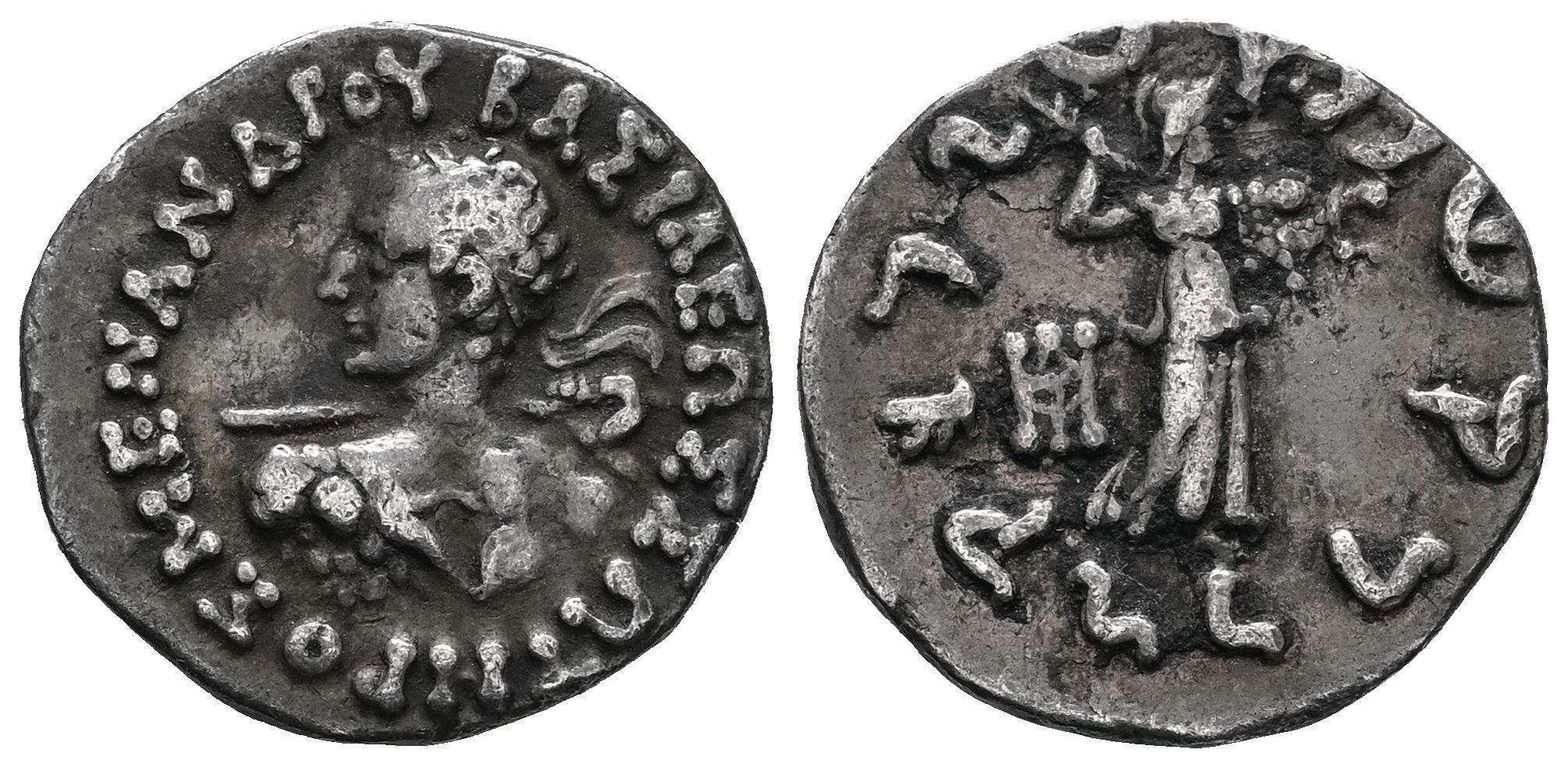 Greco-Baktrian Kingdom. Menander I Soter. Drachm. 160-155 a.C. Tower. (Mitchiner-220 d). (Gc-7604 var). Anv.: ΒΑΣΙΛΕΩΣ ΣΩΤΗΡΟΣ ΜΕΝΑΝΔΡΟΥ, Diademed bust to left, wielding spear, aegis on shoulder. Rev.: Athena Alkidemos standing to right, hurling thunderbolt and holding shield; monogram to left; Karosthi inscription around. Ag. 2,38 g. VF. Est...80,00.