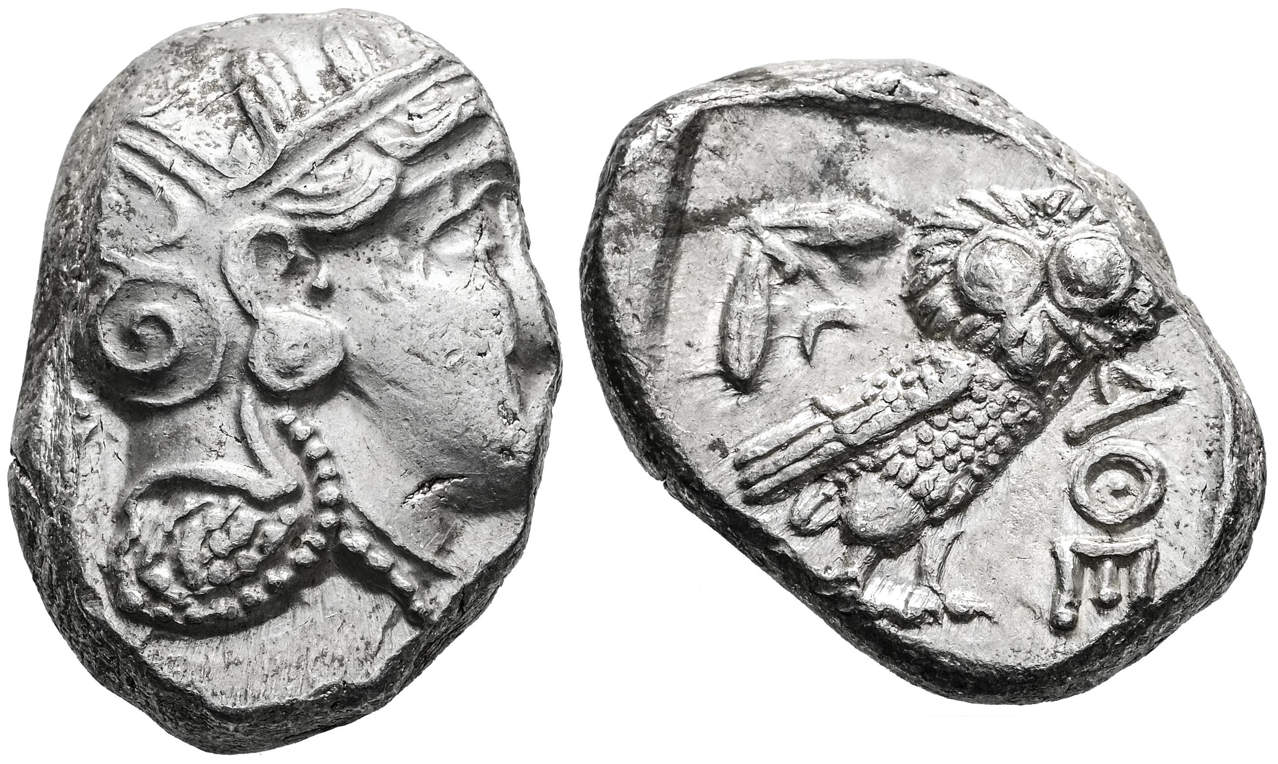 Attica. Athens. Tetradrachm. 350-294 BC. Eastern Imitation. (Kroll-Type 8). (Sng Cop-31). Anv.: Head of Athena to right, wearing earring, necklace, and crested Attic helmet decorated with three olive leaves over visor and a spiral palmette on the bowl. Rev.: Owl standing to right with head facing, olive sprig with berry and crescent in upper left field, AΘE to right; all within incuse squar. Ag. 17,19 g. Traces of luster. Choice VF/Almost XF. Est...300,00.