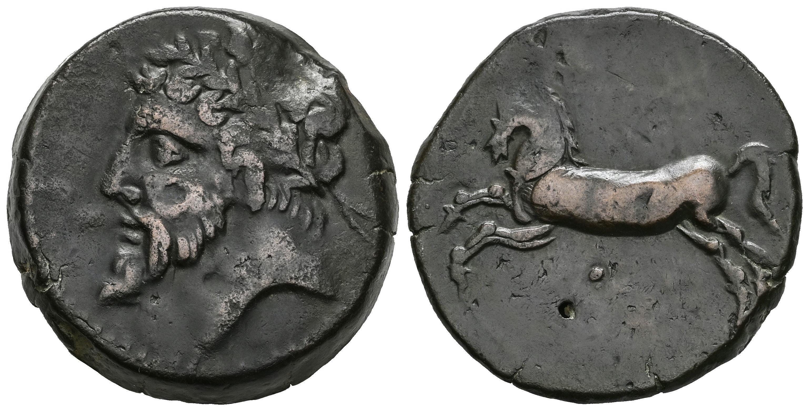 Kings of Numidia. Massinissa or Micipsa. AE 25. 203-148 BC or 148-118 BC. (Mazard-50). (MAA-18a). (Sng Cop-505). Anv.: Laureate and bearded head to left. Rev.: Horse galloping to left; pellet below. Ae. 15,92 g. VF. Est...150,00.