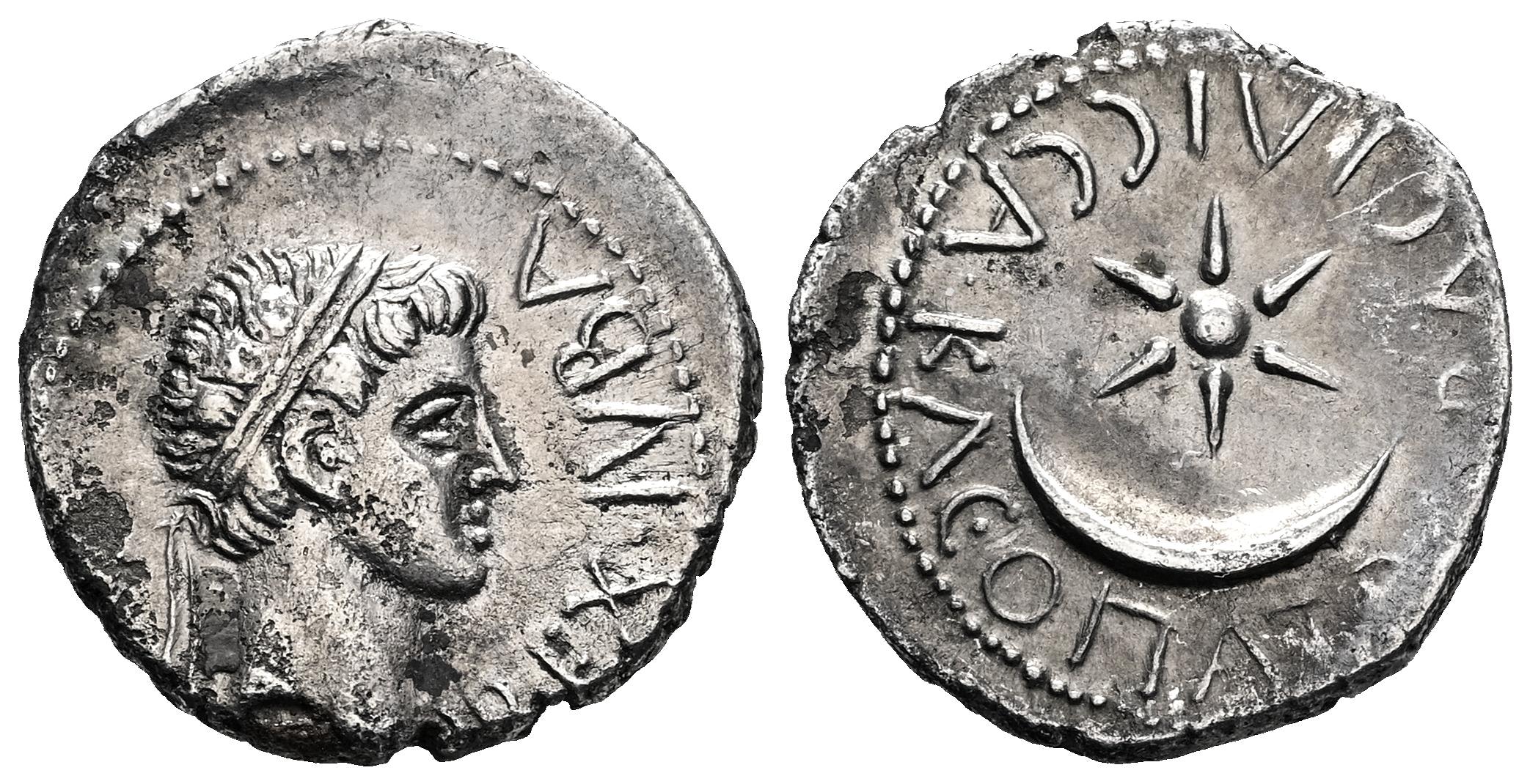 Kings of Mauretania. Juba II with Kleopatra Selene. Denarius. 11-23 AD. Caesarea. (Mazard-299). (MAA-97). (Sng Cop-567). Anv.: REX IVBA, diademed head of Juba right. Rev.: BACIΛICCA KΛEΟΠΑΤΡA, six-pointed star within crescent. Ag. 2,83 g. Slight porosities. Attractive. Choice VF/Almost XF. Est...450,00.