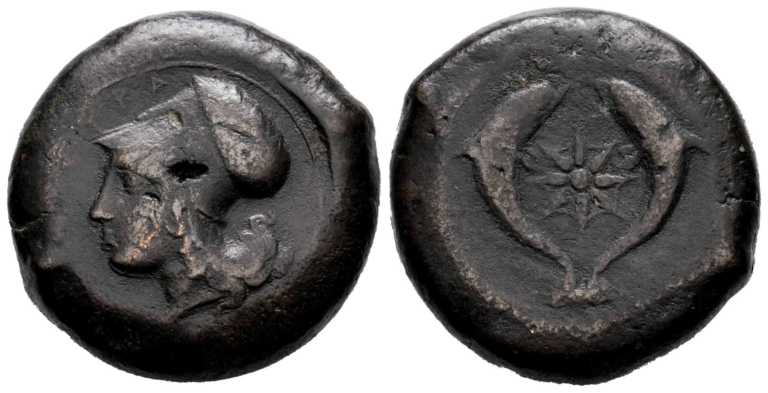 Sicily. Syracuse. AE 31. 405-367 BC. Tome of Dionysios I. (CNS-II 62). (Bmc-287). (Hgc-2, 1436). Anv.: Head of Athena to left, wearing laureate Corinthian helmet; (ΣY)PA before. Rev.: Sea-star between two dolphins. Ae. 32,35 g. Almost VF/VF. Est...120,00.
