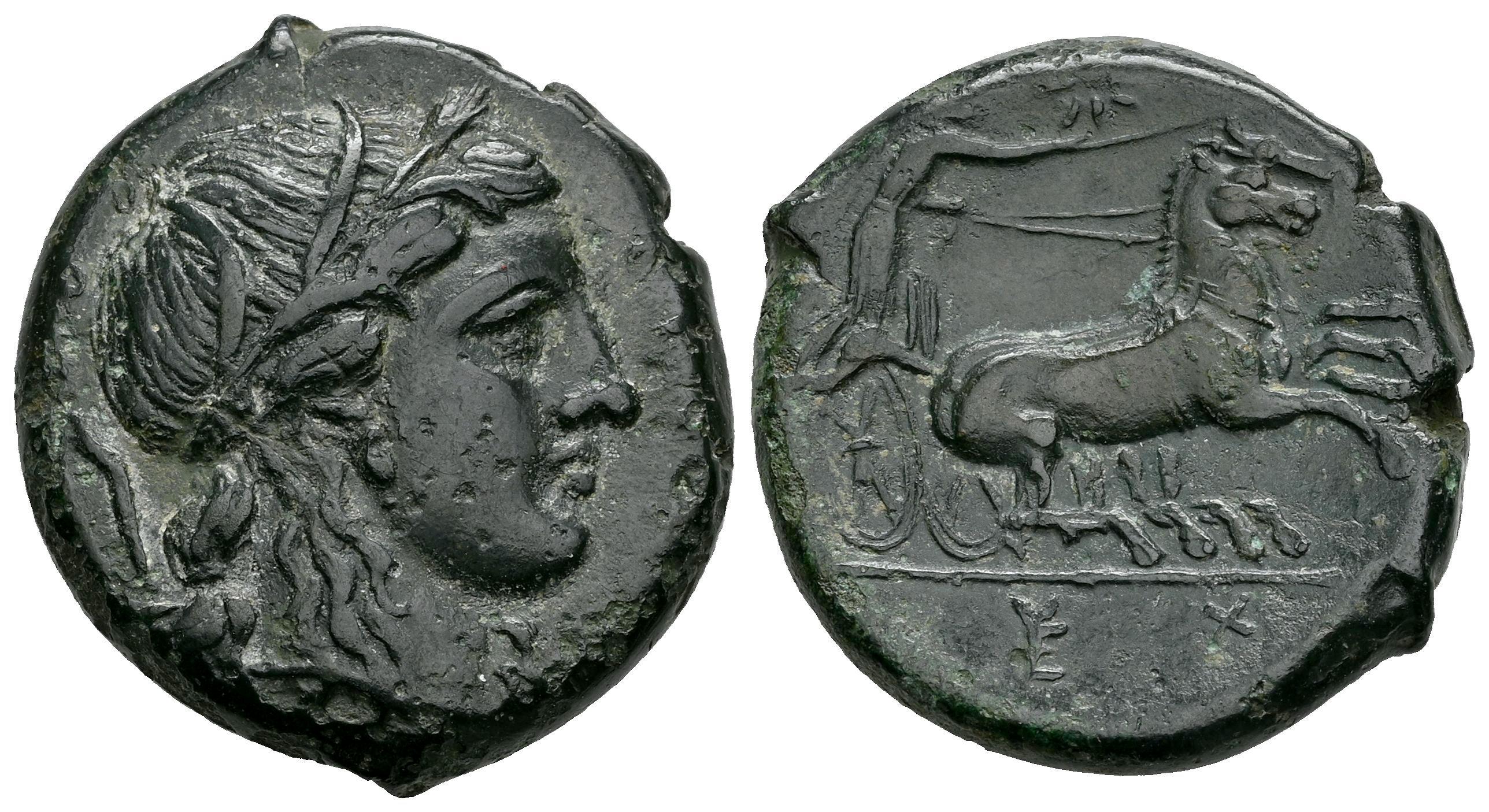 Sicily. Syracuse. AE 23. 287-278 BC. Time of Hiketas. (Hgc-2, 1447). (CNS-122 Ds 50 R1 5). Anv.: Wreathed head of Kore right; torch to left, ΣYPAKOΣIΩN before. Rev.: Charioteer driving biga right; star above, EY monogram and X in exergue. Ae. 9,49 g. Ex Nomisma (2010). Choice VF. Est...200,00.