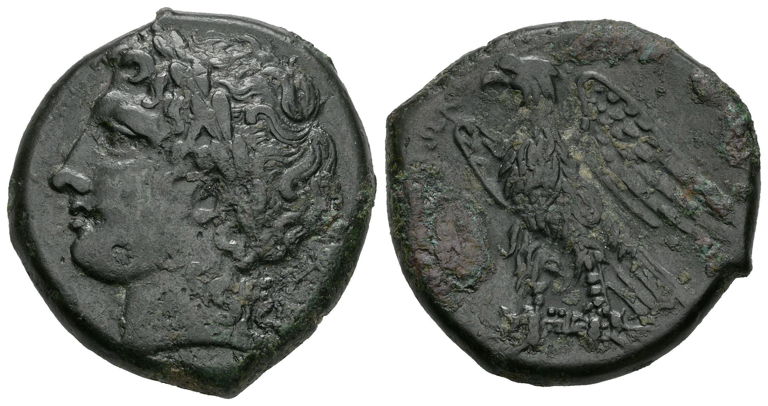 Sicily. Syracuse. AE 23. 287-278 BC. Time of Hiketas II. (CNS-154). (Hgc-2, 1448). Anv.: (ΔΙΟΣ ΕΛΛΑΝΙΟΥ), laureate head of Zeus Hellanios to left. Rev.: ΣΥΡΑΚΟΣΙΩΝ, eagle standing to left on thunderbolt. Ae. 9,78 g. Rust on reverse. Choice VF/VF. Est...90,00.