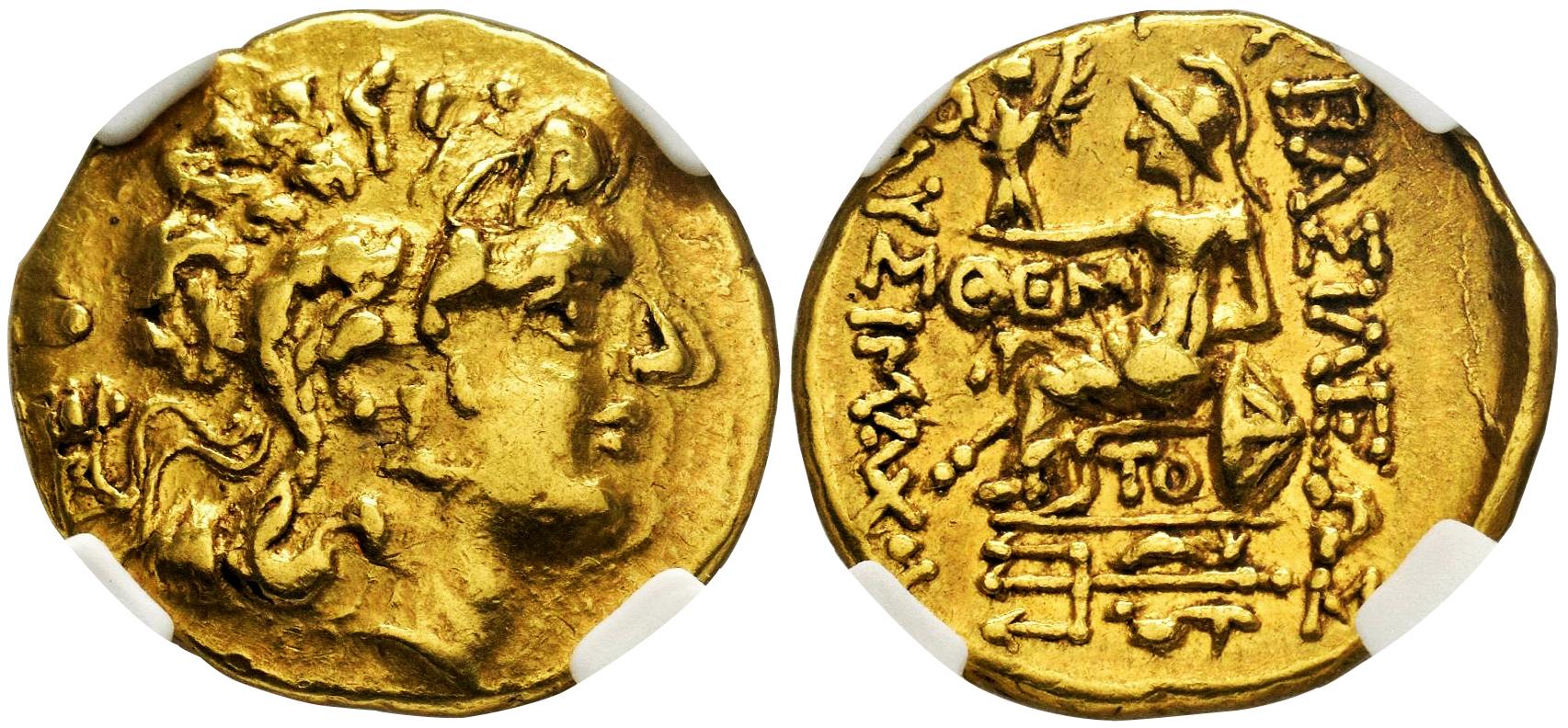 Kings of Pontos. Mithradates VI Eupator. Stater. 88-86 BC. Tomis. First Mithradatic War issue. Struck in the name and types of Lysimachos of Thrace. (Callataÿ-p. 141 (D4/R1)). (AMNG-I 2480). (Sng Cop-1091). Anv.: Diademed head of the deified Alexander to right, with horn of Ammon. Rev.: Athena Nikephoros seated to left, shield at her side; ΒΑΣΙΛΕΩΣ to right, ΛΥΣΙMΑXOY to left; ΘΕΜ to inner left, TO on throne, ornamented trident in exergue. Au. 8,26 g. Slabbed by NCV as XF 40. Ex Soler & Llach 1130 (26/04/2023), lot 10. Est...2500,00.