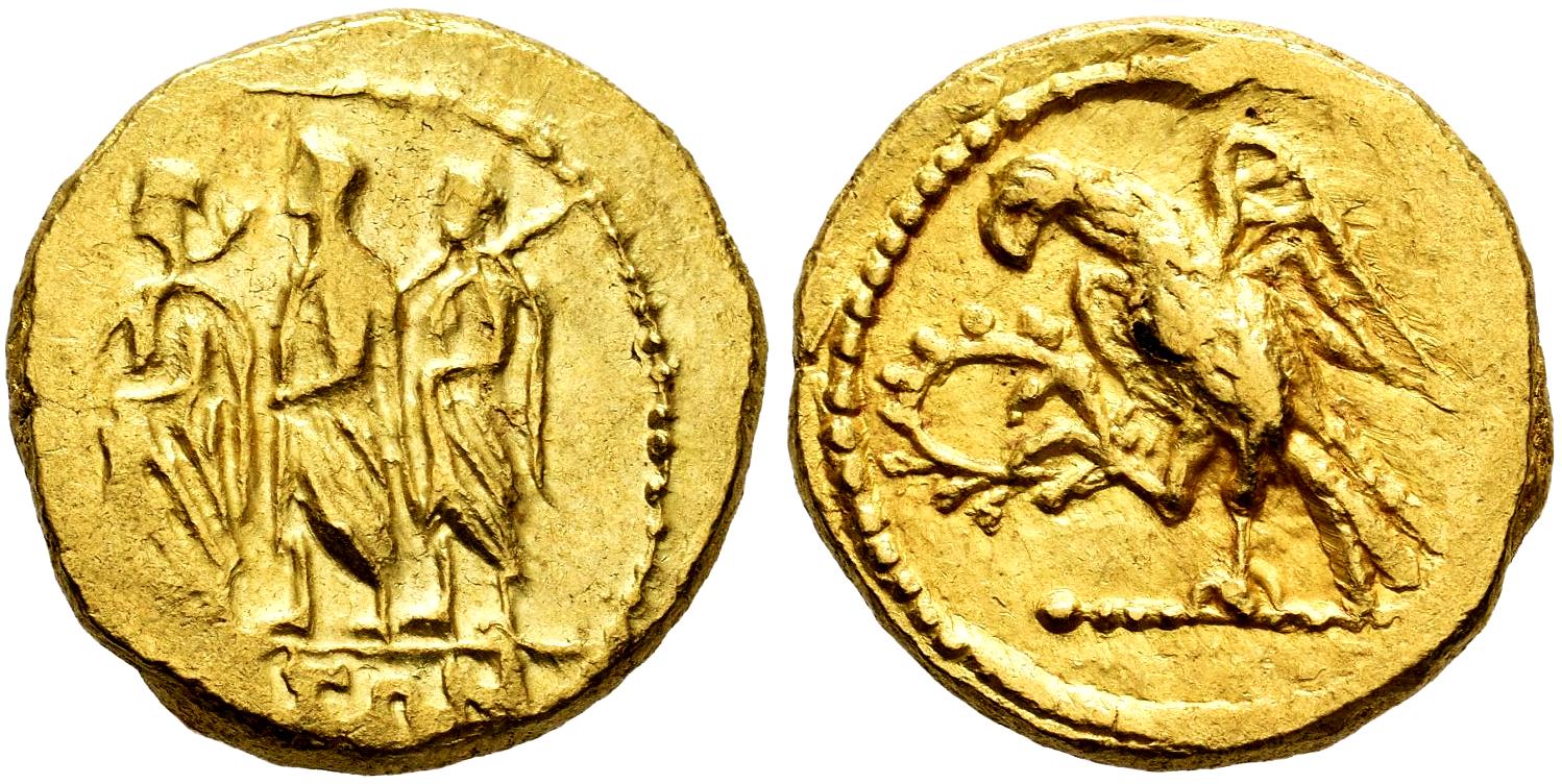 Thrace. Koson. Stater. 44-42 BC. (RPC-I 1701A). (Bmc-2). (Hgc-3.2,2.49). Anv.: Roman consul (L. Junius Brutus?) walking to left, accompanied by two lictors; OΛB monogram before, KOΣΩN in exergue. Rev.: Eagle with spread wings standing to left on sceptre, clutching laurel wreath in right talon. Au. 8,42 g. Lightly displaced struck. Choice VF. Est...1200,00.