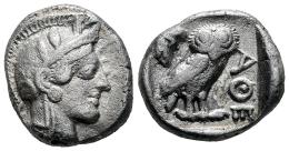 Attica. Athens. Drachm. 454-404 BC. (Kroll-10). (Sng Cop-41/3). (Hgc-4, 1631). Anv.: Head of Athena to right, wearing earring, necklace, and crested Attic helmet decorated with three olive leaves over visor and a spiral palmette on the bowl. Rev.: Owl standing to right, head facing; olive sprig and berry in upper left field, AΘE to right; all within incuse square. Ag. 4,12 g. Cleaning hairlines on reverse. Ex Num. Naumann 108 (03/10/2021), lot 216. Almost VF. Est...160,00.